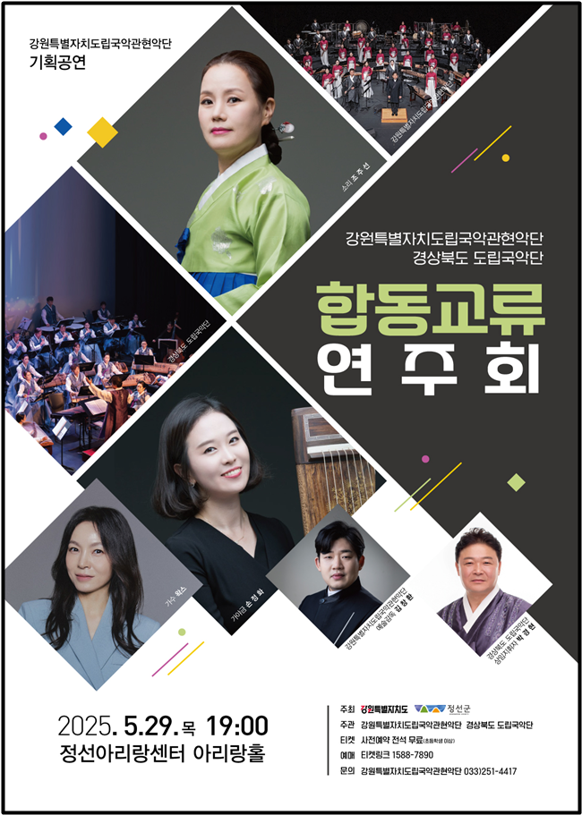 강원특별자치도립국악관현악단(단장: 정광열 경제부지사)은 경상북도 도립국악단과의 합동 교류 연주회를 오는 5월 29일(목) 오후 7시, 정선아리랑센터에서 개최한다고 밝혔다.