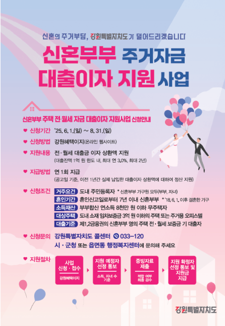 신청 기간은 61일부터 831일까지로 신혼부부 중 대표 1인이 [강원혜택이지] 온라인 사이트를 통해 신청하거나 주소지 읍면 사무소 복지팀으로 방문 신청하면 된다.