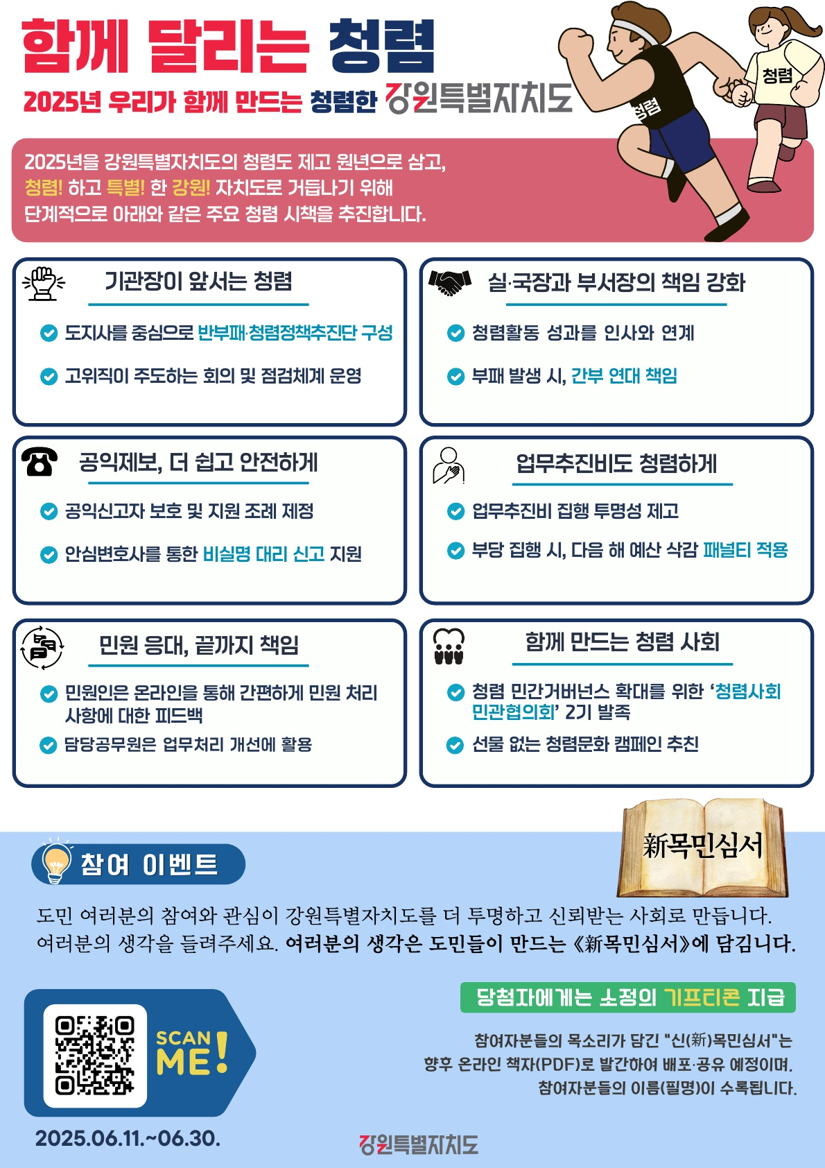 강원특별자치도는 오는 6월 11일부터 30일까지 20일간, 도민과 함께 청렴 문화를 확산하고자 ‘신(新) 목민심서 프로젝트’를 추진한다고 밝혔다.