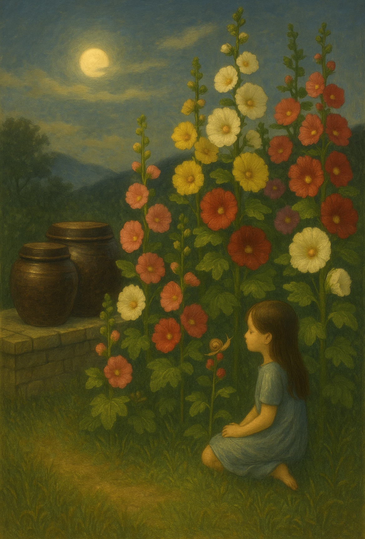 청초한 비가 쏟아진 뒤 달아오른 꽃잎 속에 소녀 웃음처럼 피어나는 사랑스러운 접시꽃