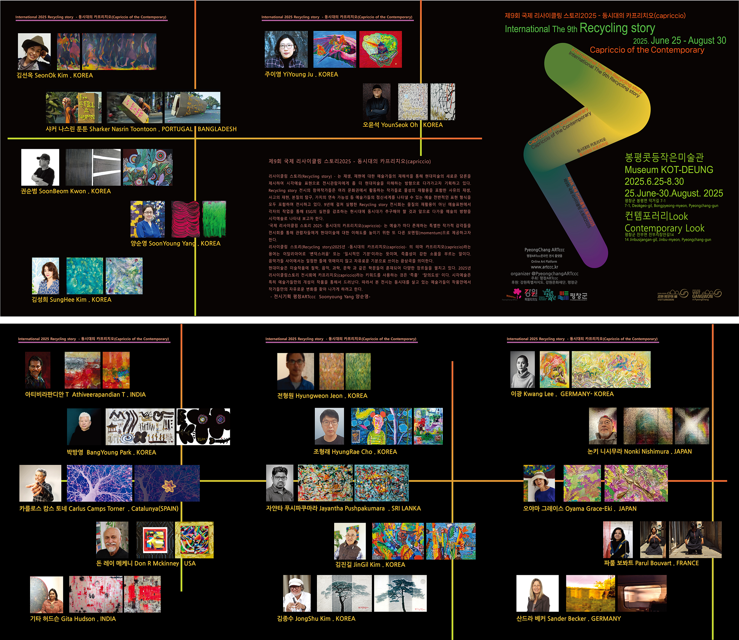국제 리사이클링 스토리(International Recycling story)2025년 테마 ‘동시대의 카프리치오(capriccio)’ 의 카프리치오(capriccio)라는 용어는 이탈리아어로 '변덕스러움' 또는 '일시적인 기분'이라는 뜻이며, 즉흥성이 강한 소품을 부르는 말이다. 음악가들 사이에서는 일정한 틀에 얶매이지 않고 자유로운 기분으로 쓰이는 광상곡을 의미한다. 현대미술은 미술작품에 철학, 음악, 과학, 문학 과 같은 학문들이 혼재되어 다양한 장르들을 펼치고 있다. 2025년 리사이클링스토리 전시회에 카프리치오(capriccio)라는 키워드를 사용하는 것은 ‘즉흥’ '탈의도성' 이다. 시각예술은 특히 예술가들만의 개성이 작품을 통해서 드러난다. 따라서 본 전시는 동시대를 살고 있는 예술가들이 작품안에서 작가들만의 자유로운 변화를 찾아 나가며 예술가마다 존재하는 특별한 작가적 감각들을 전시회를 통해 관람자들에게 현대미술에 대한 이해도를 높이기 위한 또 다른 모멘텀(momentum)으로 제공하고자 한다.
