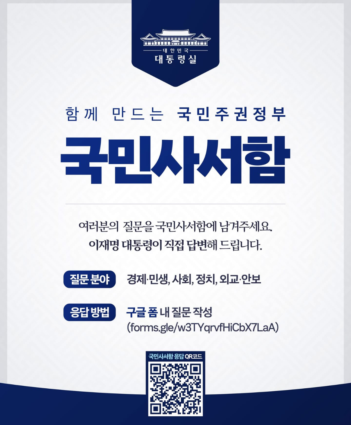 ‘국민사서함’은 경제, 민생, 사회, 정치, 외교, 안보 등 국정 전반에 대한 국민의 질문과 제안을 자유롭게 남길 수 있는 온라인 창구이며, 국민적 공감이 큰 사안에 대해서는 이재명 대통령이 직접 답변에 나설 예정이다.