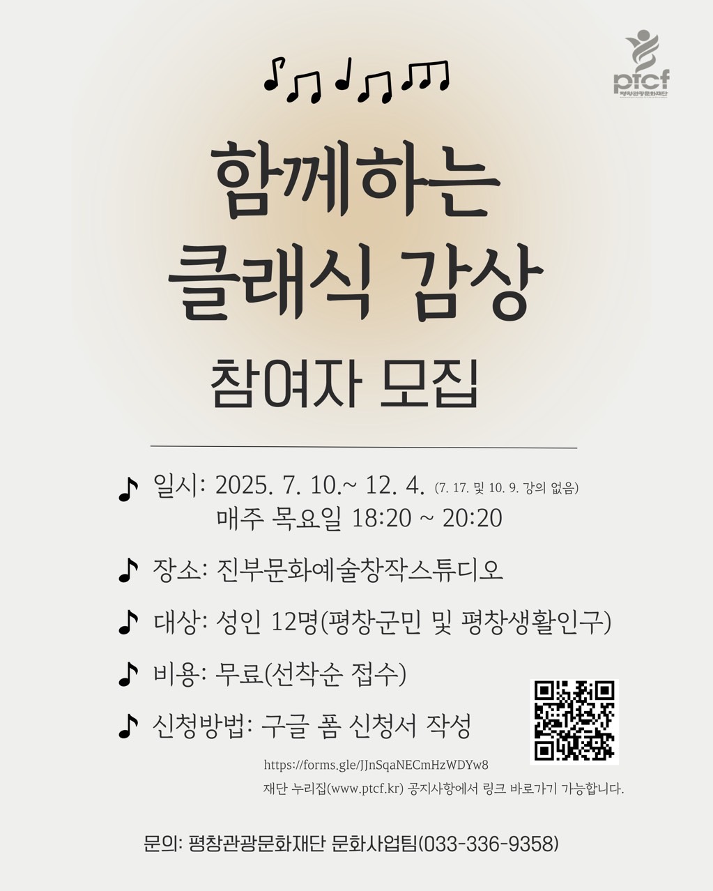 평창군민의 문화 향유 기회를 넓히고자 평창관광문화재단이 운영하는 성인 대상 클래식 감상 입문 프로그램 『함께하는 클래식 감상』이 오는 7월 10일부터 12월 4일까지 총 20회차로 진부문화예술창작스튜디오에서 진행된다.