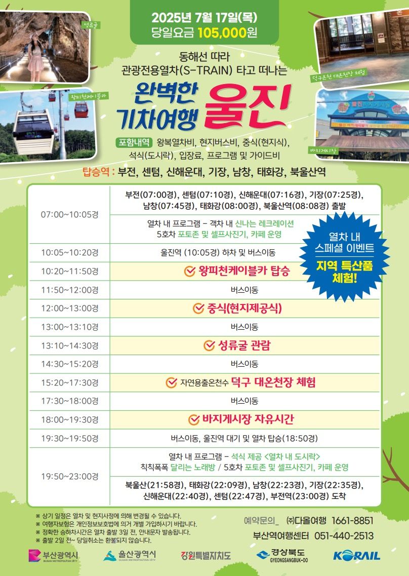 강원특별자치도 김동준 관광정책과장은 “부산‧울산 지역에서 강원도 관광에 보여주신 뜨거운 관심에 감사드린다”며 “7월 19일 동해‧삼척에서 출발하는 ‘완벽한 기차여행’ 상품 중 울산 및 부산행 코스는 현재 여유 좌석이 있어 보다 여유롭게 참여하실 수 있는 기회인 만큼 강원도민과 관광객 여러분의 많은 관심과 예매 부탁드린다”고 전했다.