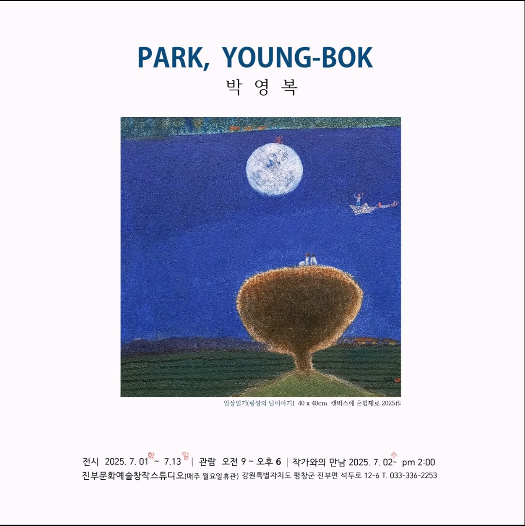 진부문화예술창작스튜디오에서는 7월 13일까지 박영복 작가의 ‘평창의 달 이야기’ 전시가 열린다. 평창의 밤하늘을 바라보며 떠올린 단상들을 회화로 풀어낸 이 전시는 지역성과 서정성이 잘 어우러진다.