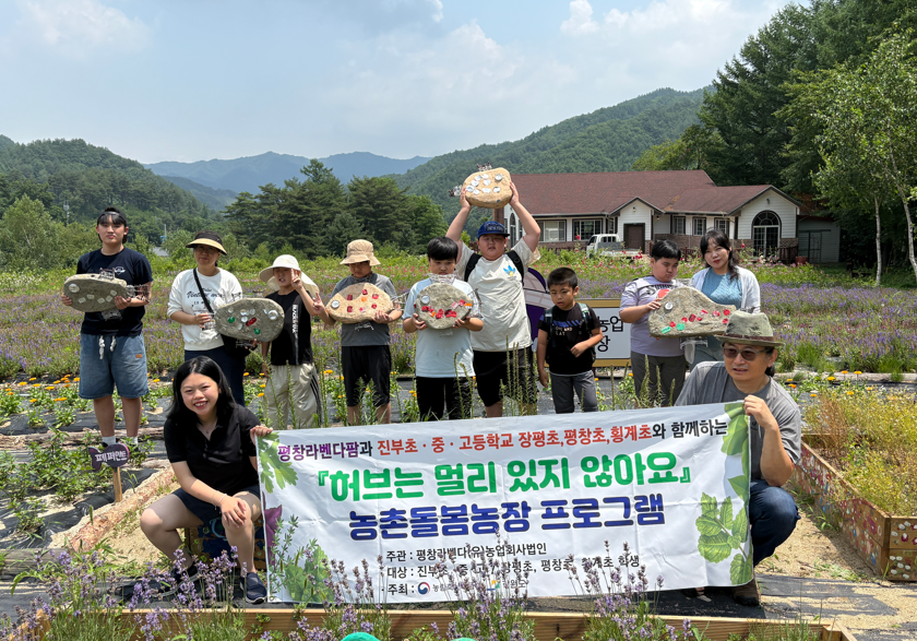 지난 7월 8일, 평창 라벤다팜에서 열린 ‘허브와 함께하는 힐링프로그램’은 총 10회차 운영 중 열 번째 프로그램으로, 진부면 내 초·중·고등학교 특수반 학생 7명을 대상으로 진행되었다.