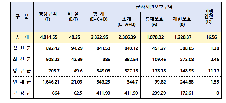 도내 군사규제구역은 접경지역 7개 시군* 중 철원, 화천, 양구, 인제, 고성 5개 군에 집중되어 있다. 5개 군의 군사규제구역 총 면적(2,323㎢)은 행정구역 면적(4,815㎢)의 48.2%에 해당할 정도이며 주민들은 영농 활동, 건축, 재산권 행사 등 일상생활에서 심각한 제약을 받고 있는 실정이다.