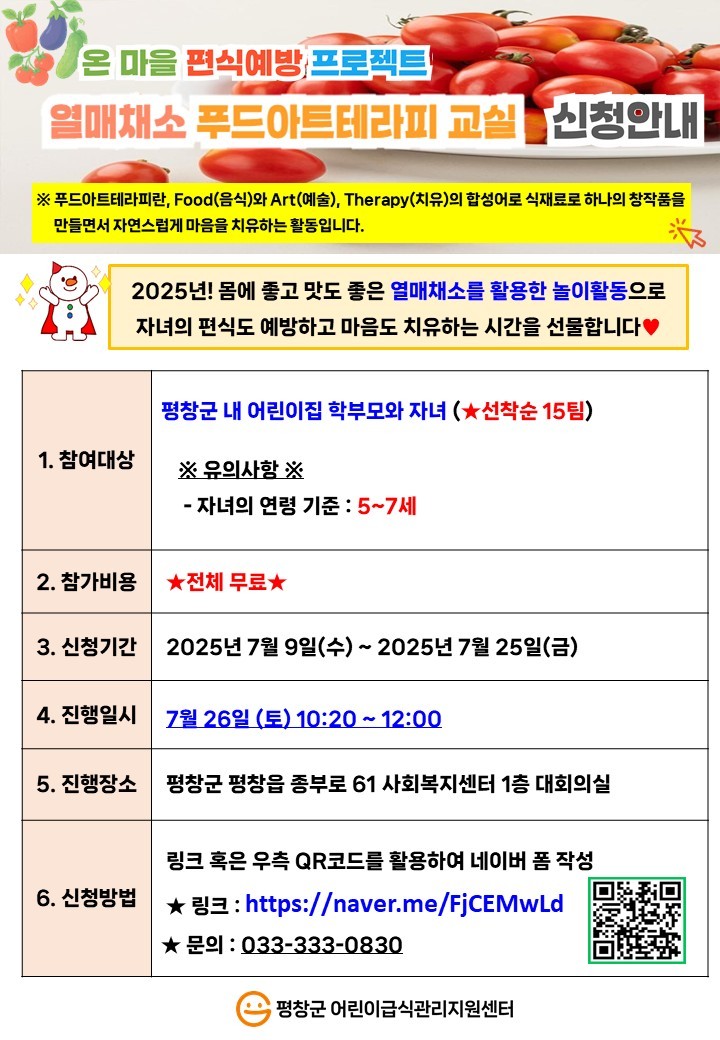 평창군어린이급식관리지원센터는 오는 7월 26일(토) 오전 10시 20분부터 12시까지, 평창읍 종부토 61에 위치한 사회복지센터 1층 대회의실에서 ‘2차 열매채소 푸드아트테라피 교실’을 진행한다고 밝혔다.