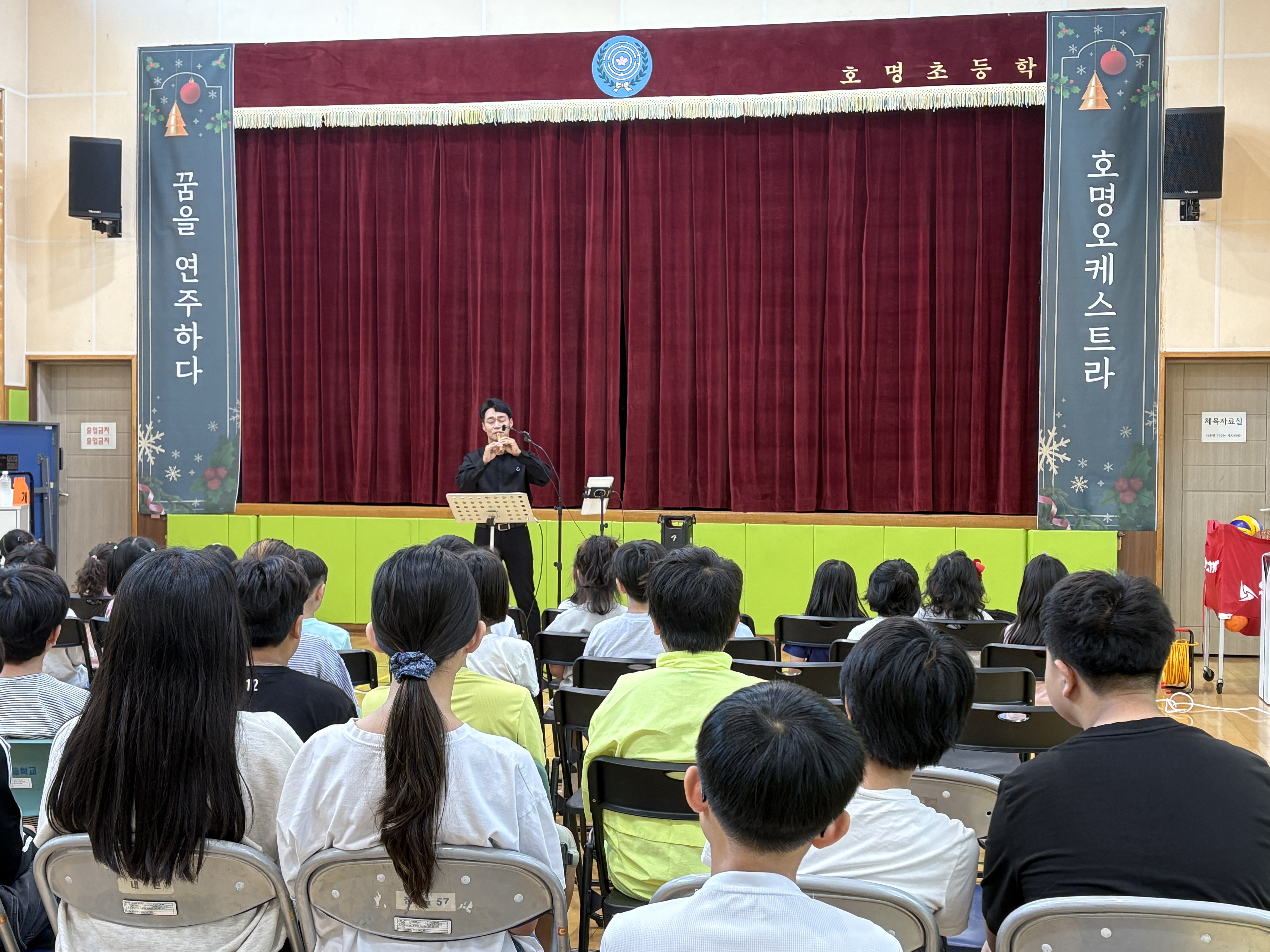 이번 사업은 호명초등학교 전교생 64명을 대상으로, 리코더 수업과 연주회를 함께하는 방식으로 운영됐다. 특히 학교 오케스트라 소속 학생들과 일반 학생들이 함께 참여해, 음악을 매개로 소통하고 협력하는 뜻깊은 시간을 가졌다.