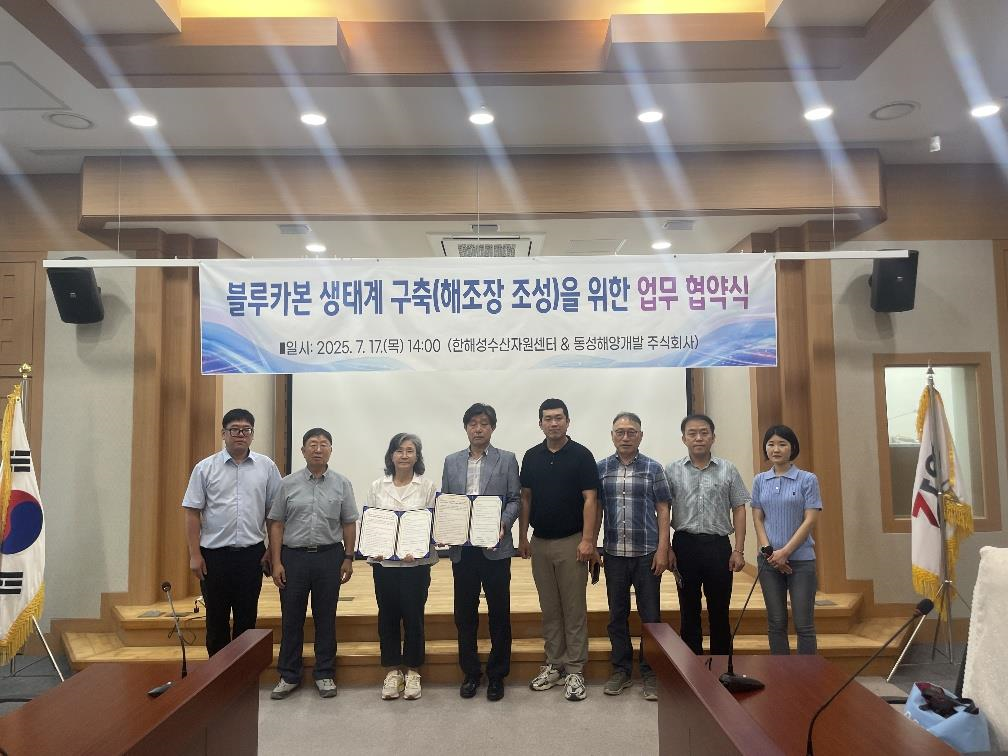 강원특별자치도 한해성수산자원센터(소장 임순형)는 7월 17일(목), 해조 생육 블록 특허 보유 업체인 동성해양개발㈜와 블루카본(blue carbon) 생태계 구축을 위한 업무협약(MOU)을 체결했다고 밝혔다.