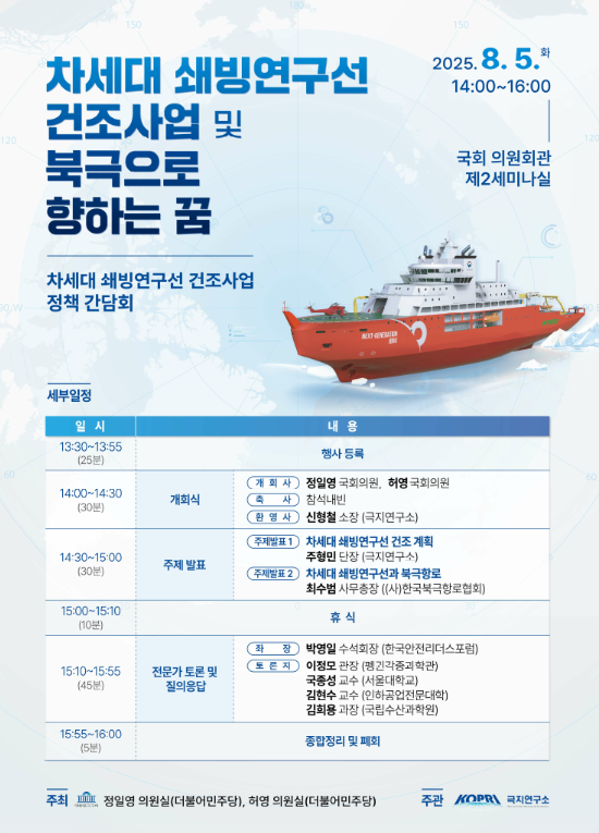 허영 국회의원 ( 더불어민주당 · 춘천 · 철원 · 화천 · 양구 갑 ) 이 공동 주최하고 극지연구소가 주관하는 ‘ 차세대 쇄빙연구선 건조사업 정책 간담회 ’ 가 8 월 5 일 ( 화 ) 오후 2 시 국회의원회관 제 2 세미나실에서 개최된다 .