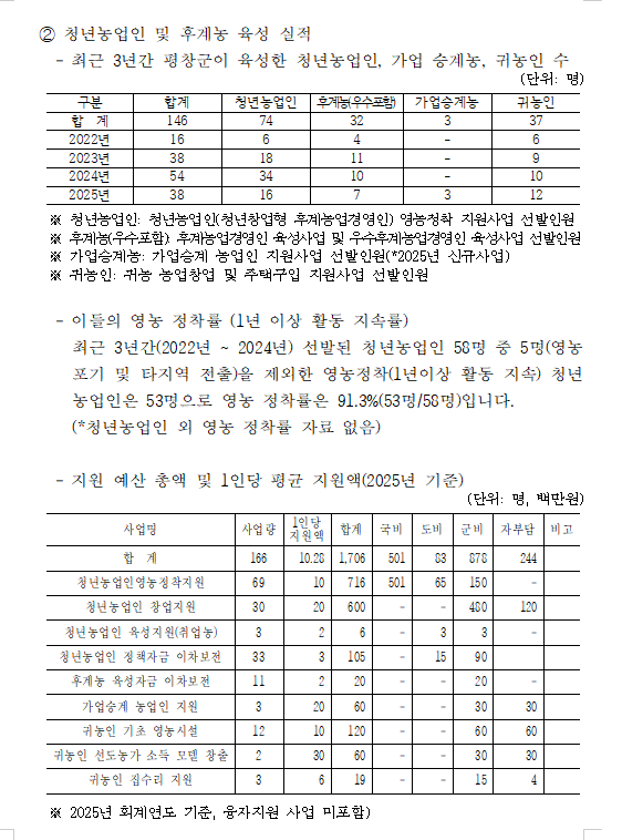 ② 청년 농업인 및 후계 농 육성 실적 질의