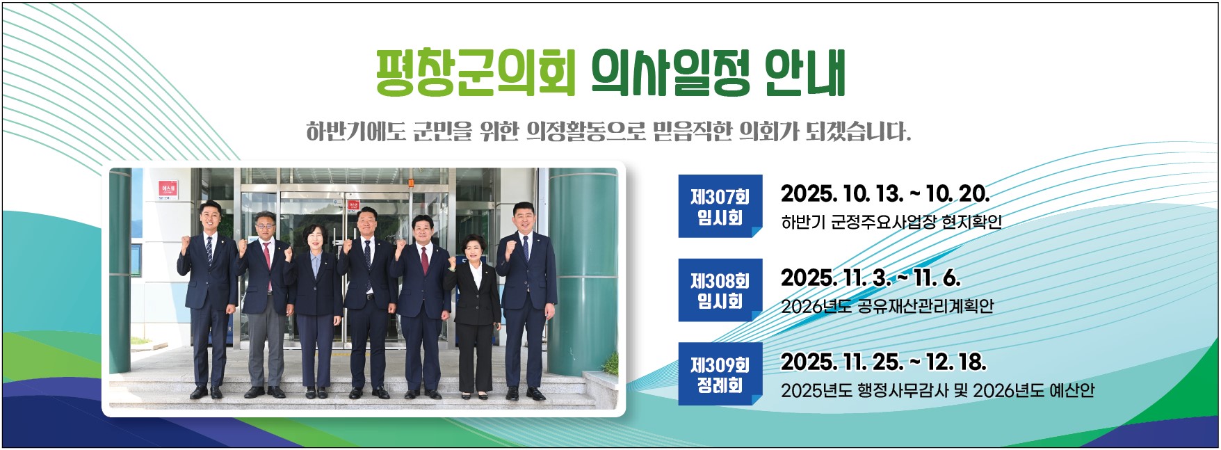 평창군의회가 2025년도 하반기 의사일정을 확정하고 군민들을 위한 의정활동에 본격적으로 나선다. 군의회는 군민 생활과 직결된 주요 사업 및 예산을 심의하며 “믿음직한 의회”로서의 역할을 다하겠다는 각오를 밝혔다.