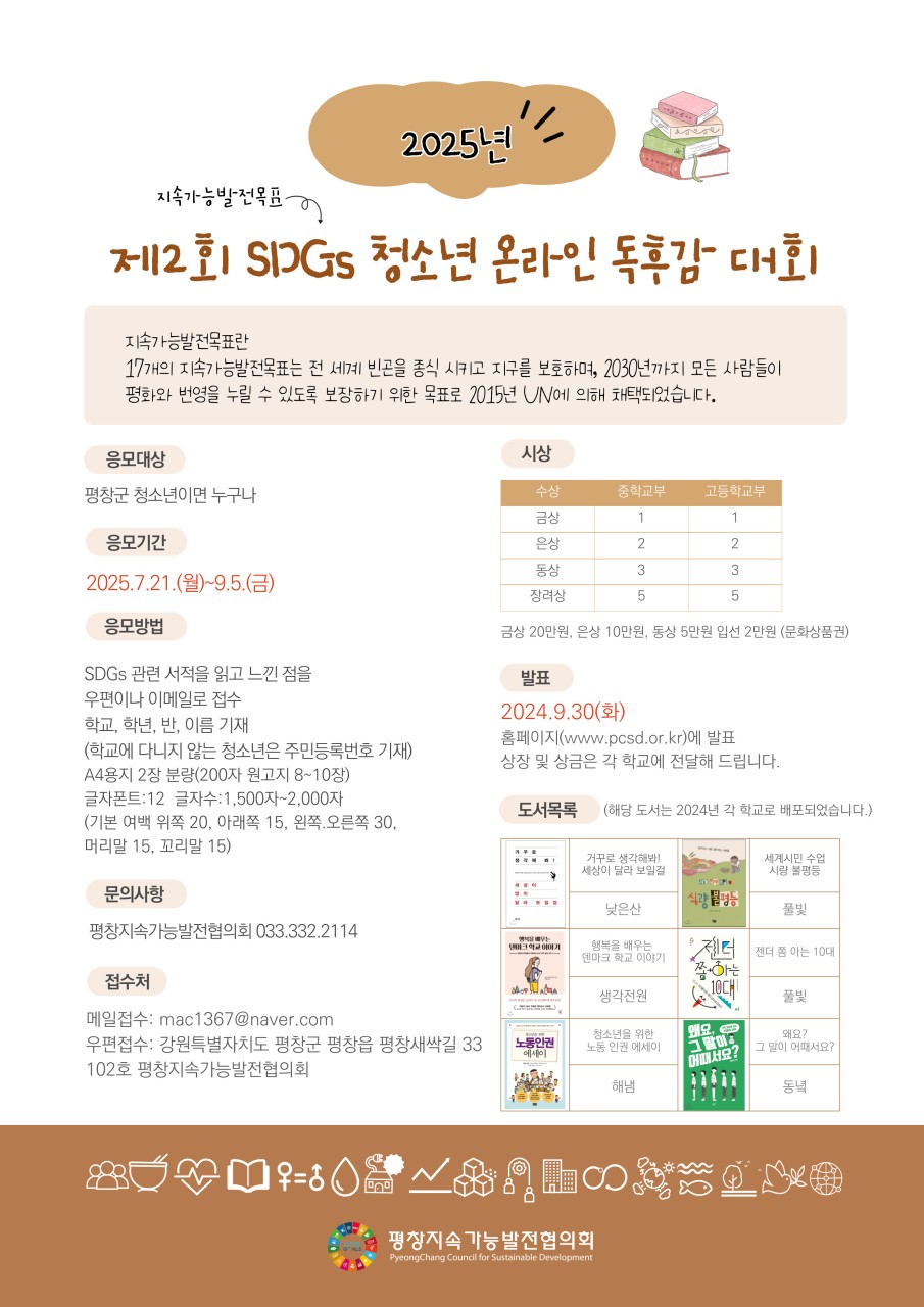 평창지속가능발전협의회는 UN 지속가능발전목표(SDGs) 확산을 위해 제2회 SDGs 도서 온라인 청소년 독후감 대회를 개최한다. 응모 기간은 7월 21일부터 9월 5일까지이며, 평창군 청소년 누구나 참여할 수 있다.