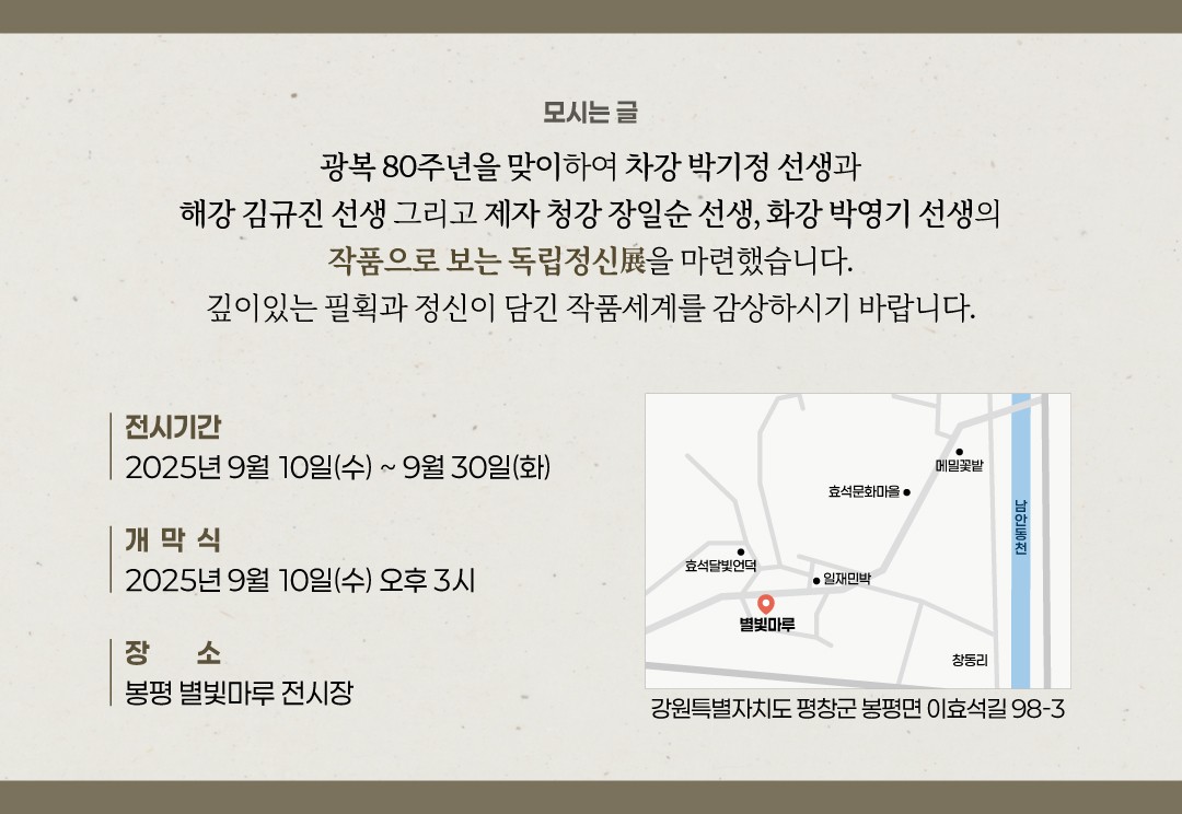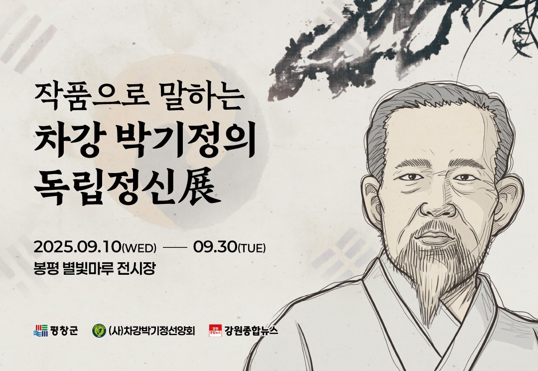 광복 80주년을 맞아 독립운동가이자 서예가였던 차강 박기정 선생의 삶과 예술혼을 기리는 전시회가 오는 9월 10일부터 30일까지 강원특별자치도 평창군 봉평면 별빛마루 전시장에서 열린다.