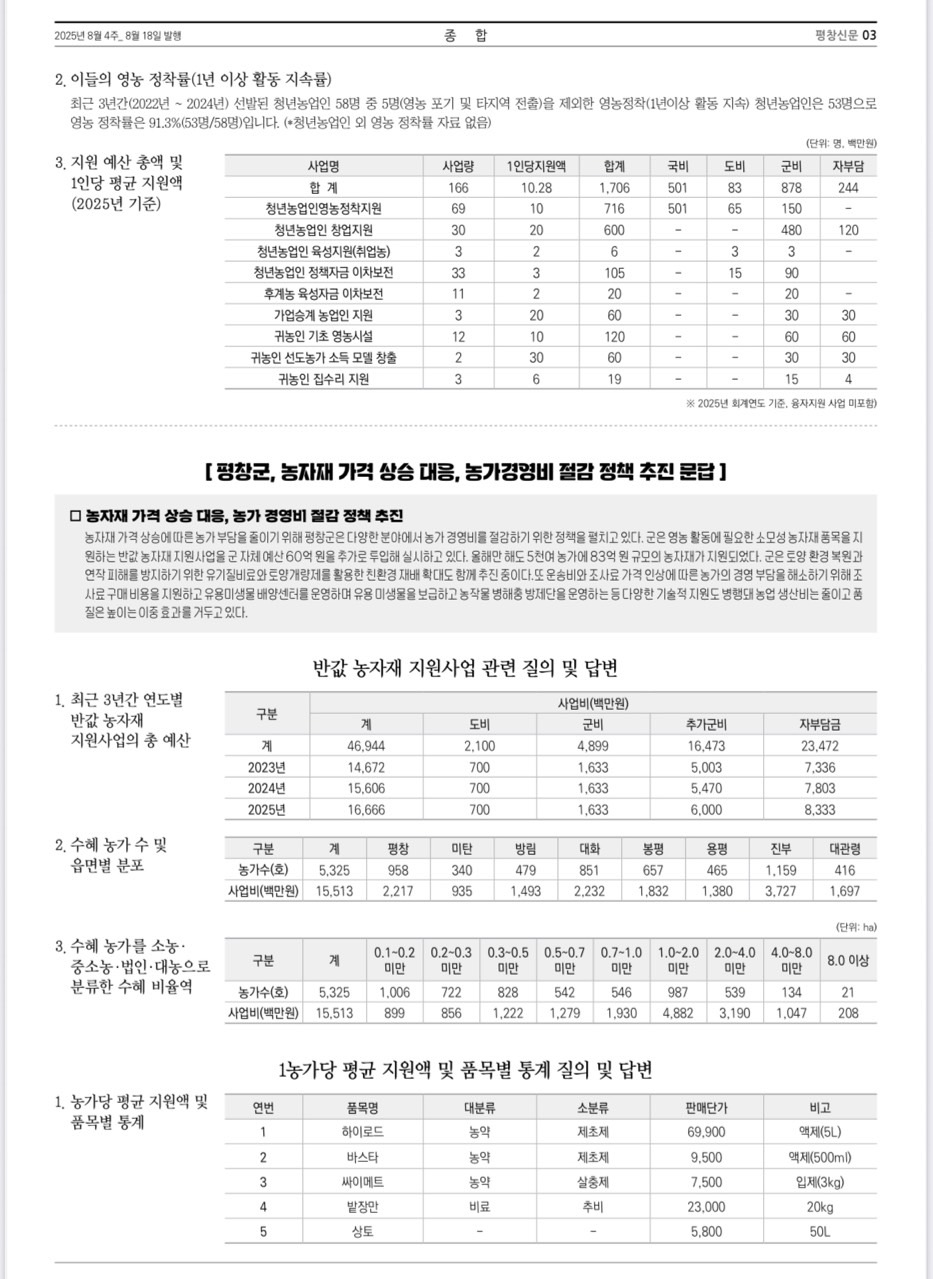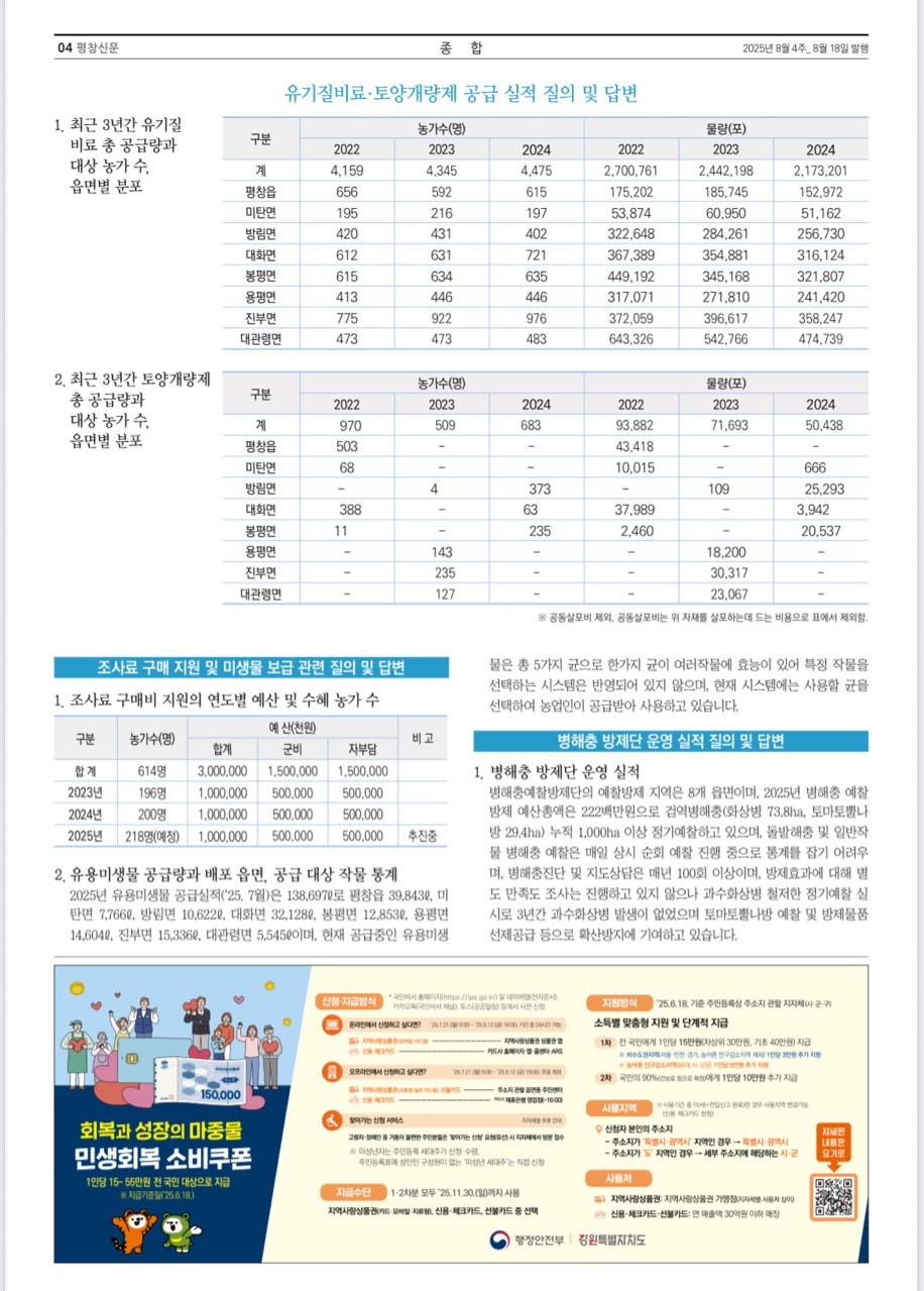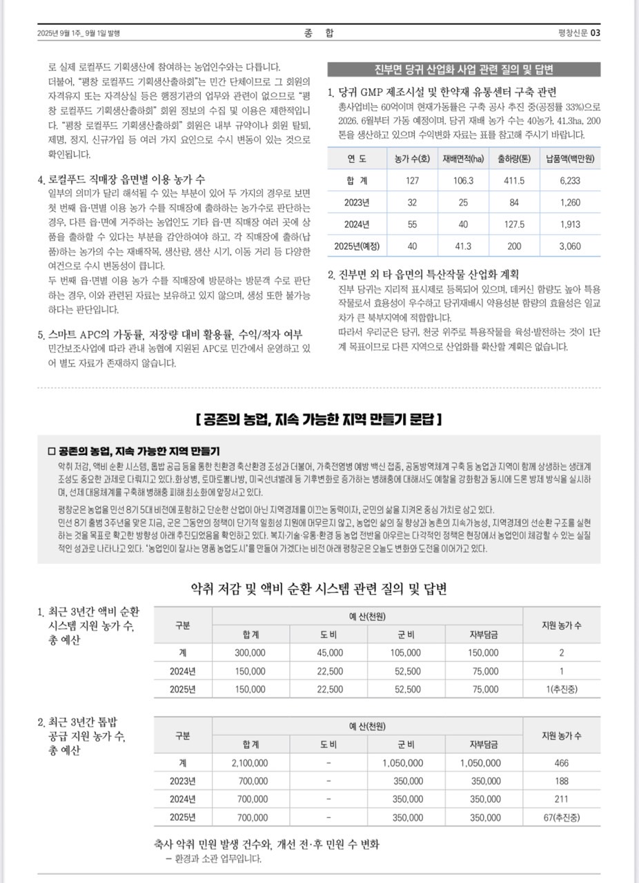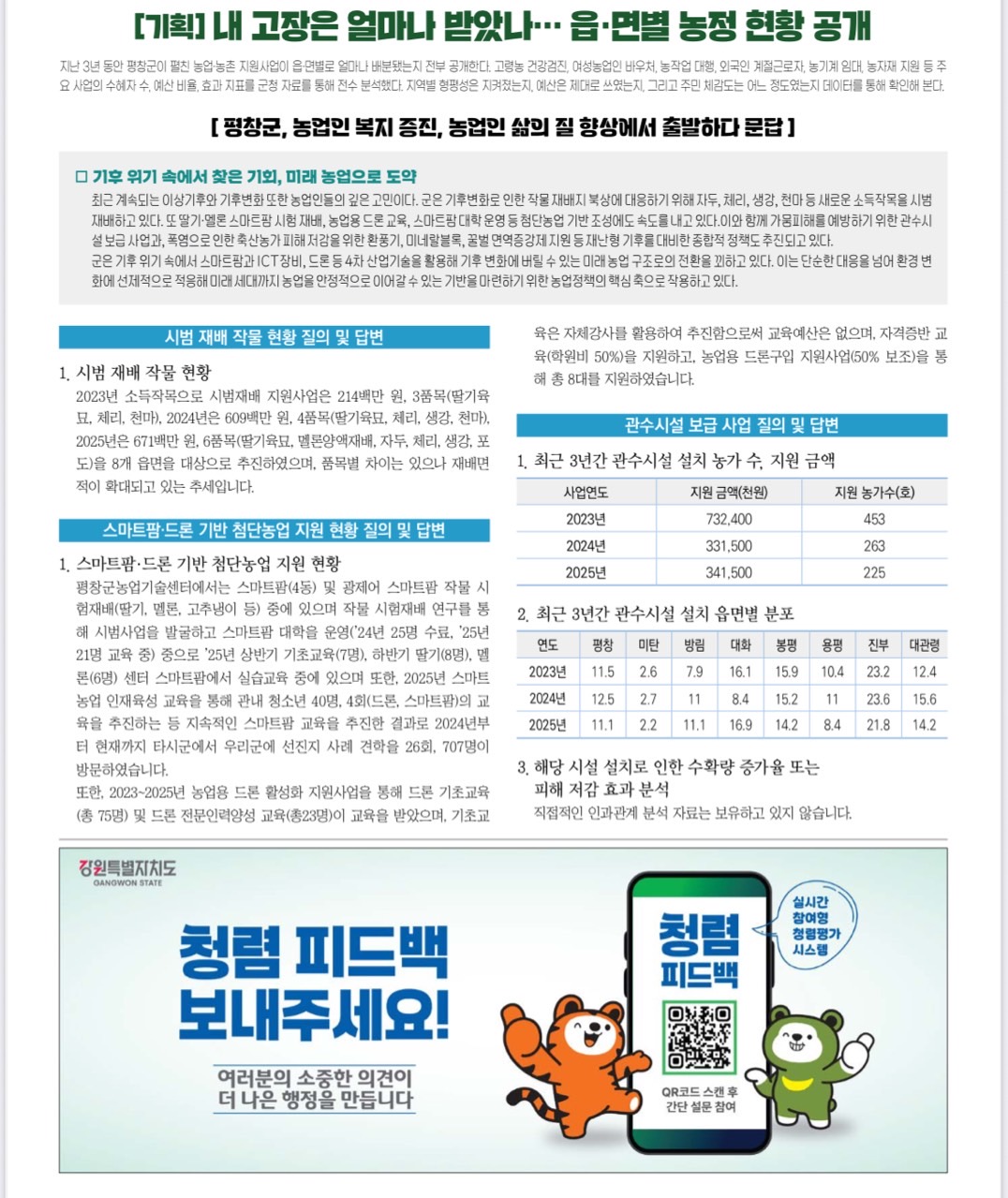 군의 시책에 맞추어야 하는 제약도 있겠지만, 보도자료에 성심껏 답변을 주셨다는 사실 자체가 군민을 위해 최선을 다하고 있다는 방증이라 생각합니다. 이러한 대응이야말로 군민과의 신뢰를 쌓는 가장 중요한 밑거름일 것입니다.