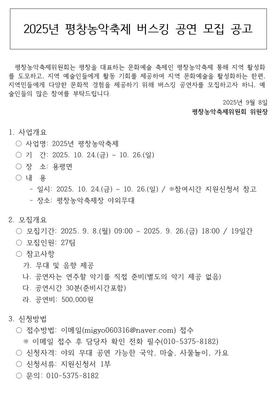 평창농악축제위원회는 오는 2025년 10월 24일부터 26일까지 용평면 일대에서 열리는 2025 평창농악축제를 맞아 지역 예술인들에게 활동 기회를 제공하고, 지역민과 방문객들에게 다양한 문화적 경험을 선사하기 위해 버스킹 공연 참가자를 모집한다고 8일 밝혔다.