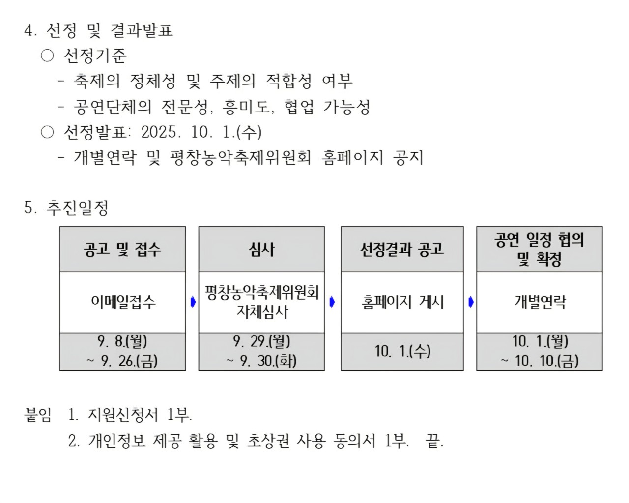 선정 기준은 축제의 정체성과 주제의 적합성 여부, 공연단체의 전문성, 흥미도, 협업 가능성 등이 종합적으로 고려된다. 선정 결과는 10월 1일(수) 개별 통보되며, 평창농악축제위원회 홈페이지에도 공지될 예정이다. 이후 10월 10일까지 공연 일정 협의를 거쳐 최종 확정된다.