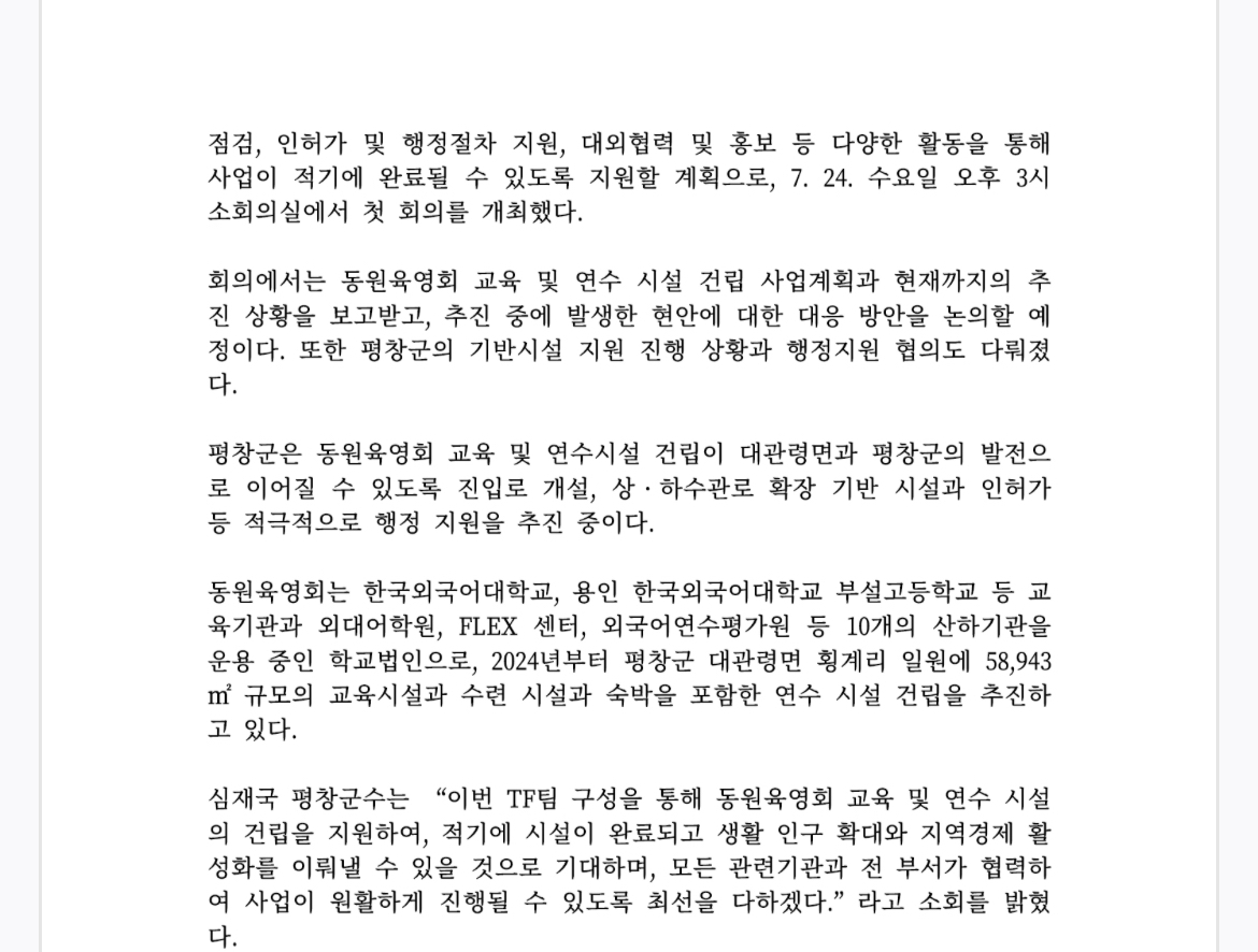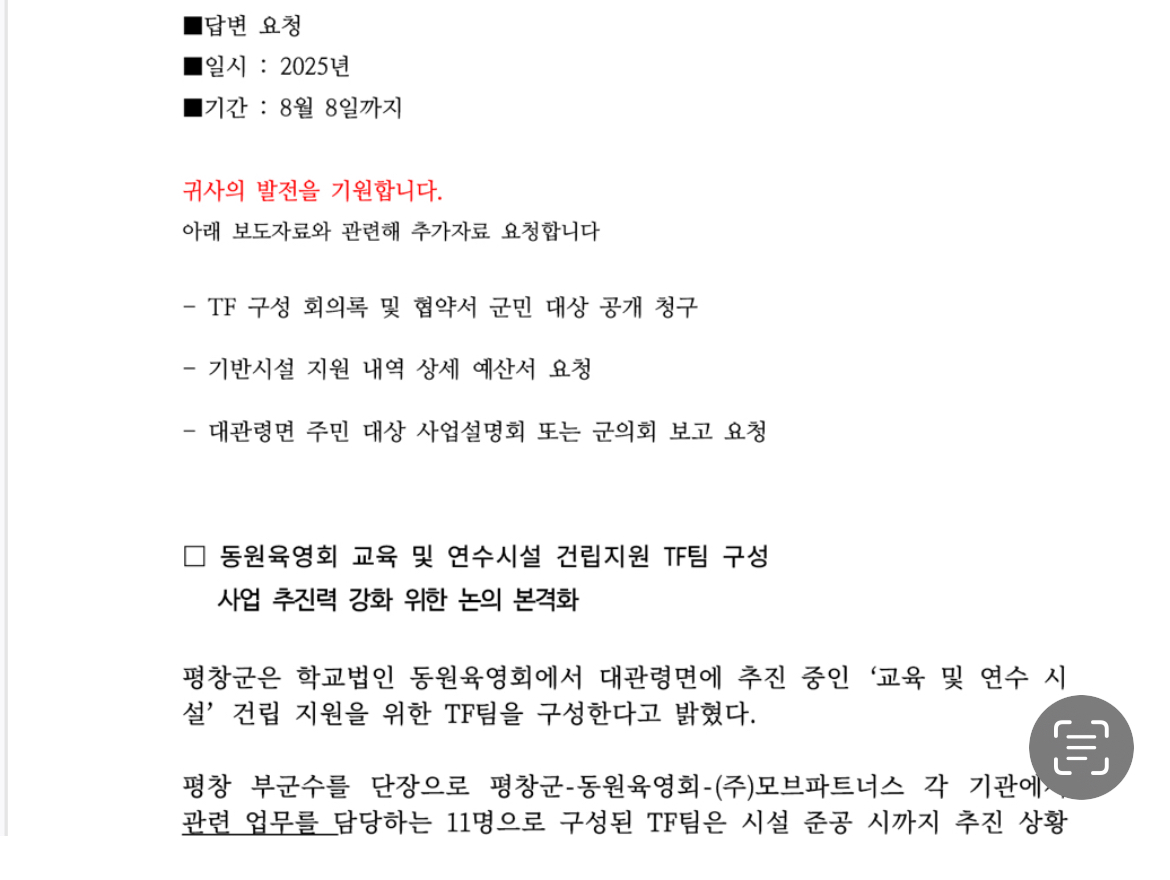 지난 7월 평창군은 동원육영회의 교육·연수시설 건립 지원을 위해 태스크포스(TF)를 구성하고, 행정·재정적 지원을 약속한 바 있다. 그러나 평창신문이 ▲TF 회의록 및 협약서 공개 ▲기반시설 지원 내역 상세 예산서 ▲대관령면 주민 대상 사업설명회 또는 군의회 보고 여부 등을 공식 요청했으나, 현재까지 군의 구체적인 답변은 없는 상태다.
