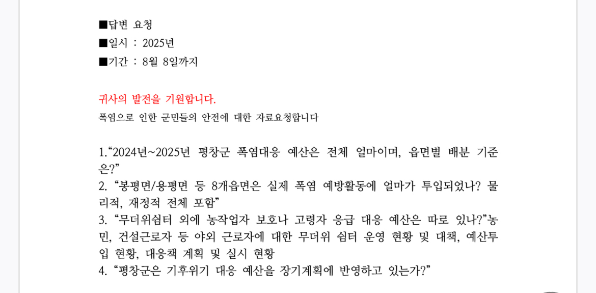 또한 폭염으로 인한 군민 안전 대책과 관련해 평창신문은 군에 ▲2024~2025년 폭염 대응 예산 총액 및 읍면별 배분 기준 ▲실제 폭염 예방활동 투자 내역 ▲무더위쉼터 및 야외 근로자 보호 대책 현황과 예산 투입 내역 ▲기후위기 대응 예산의 장기계획 반영 여부 등을 질의했지만, 이 역시 답변이 지연되고 있다.