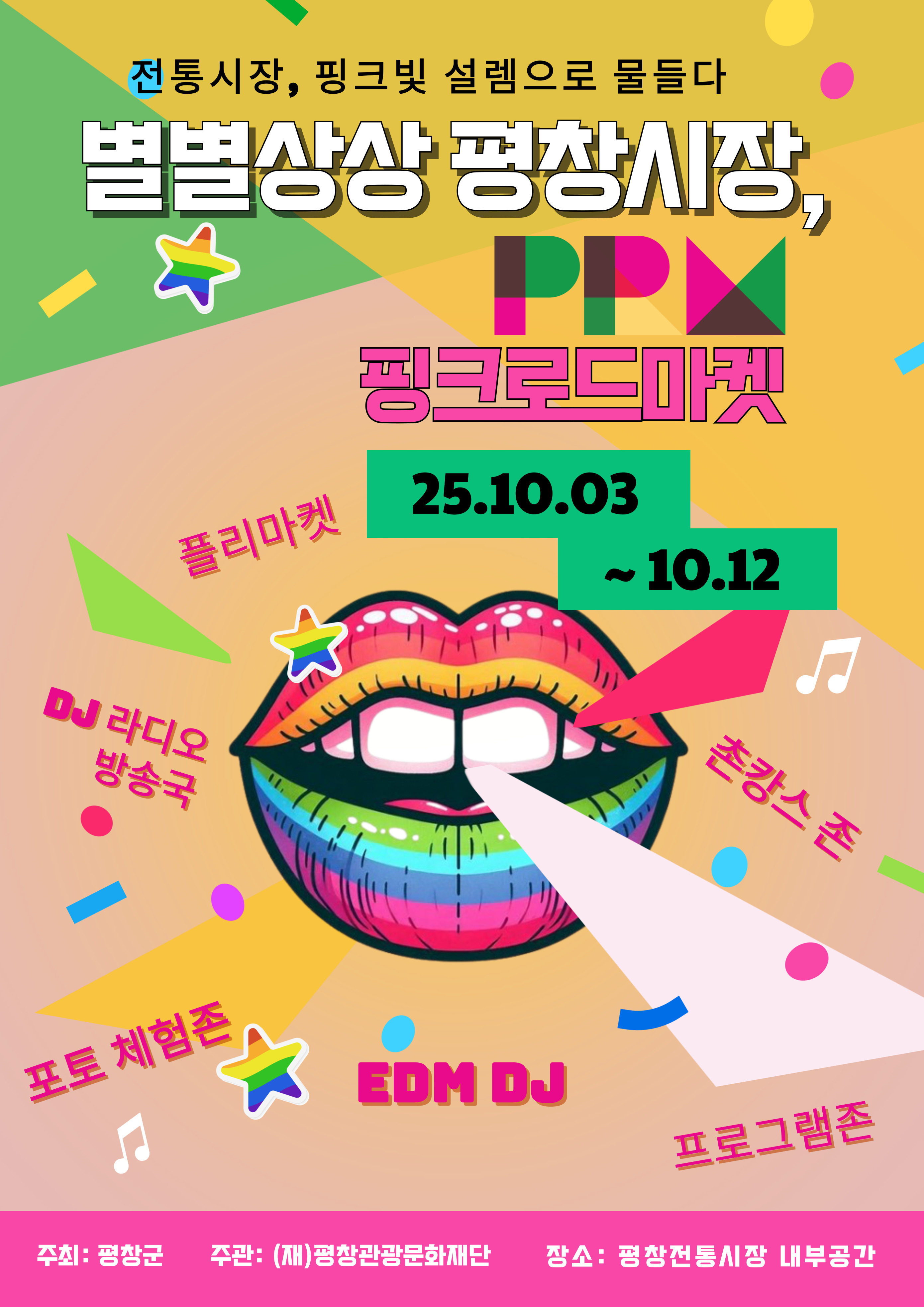 평창군과 (재)평창관광문화재단은 오는 10월 3일(금)부터 12일(일)까지 10일간, 평창읍 전통시장(올림픽 시장)에서 「2025 별별상상, 평창시장」을 개최한다.