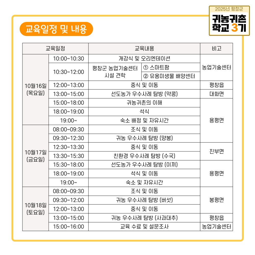 교육 내용은 평창군의 귀농·귀촌 지원정책 소개를 비롯해 선도농가 및 친환경 농가 우수사례 탐방, 지역 농업 현장체험 등으로 구성된다. 참가자들은 스마트팜, 유용미생물 배양센터, 친환경 농장 등 평창군의 다양한 농업 현장을 직접 둘러보며 실질적인 정보를 얻을 수 있다.