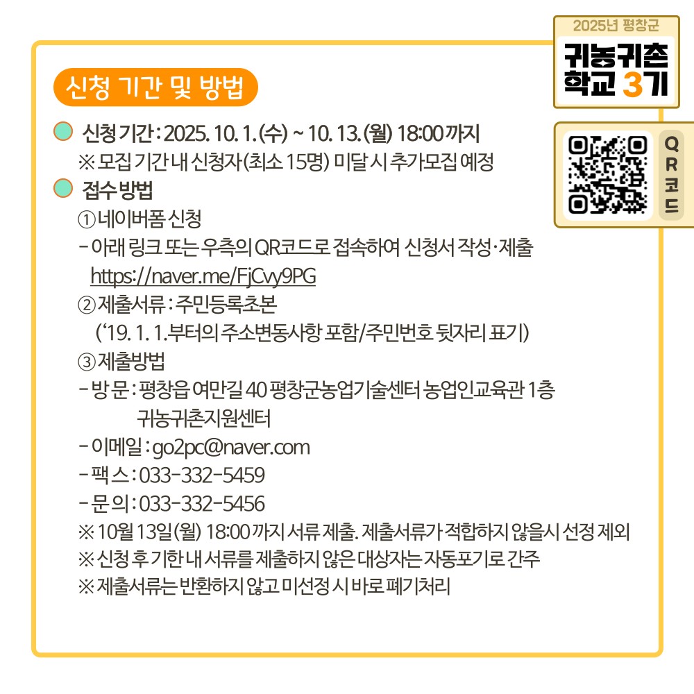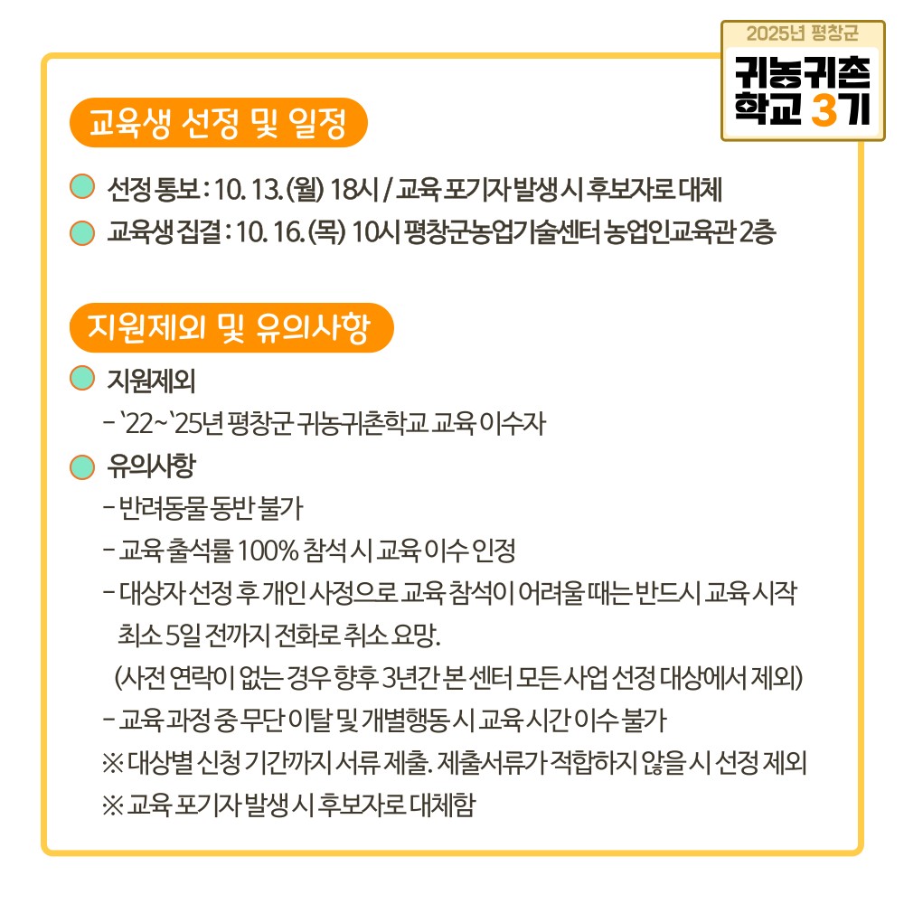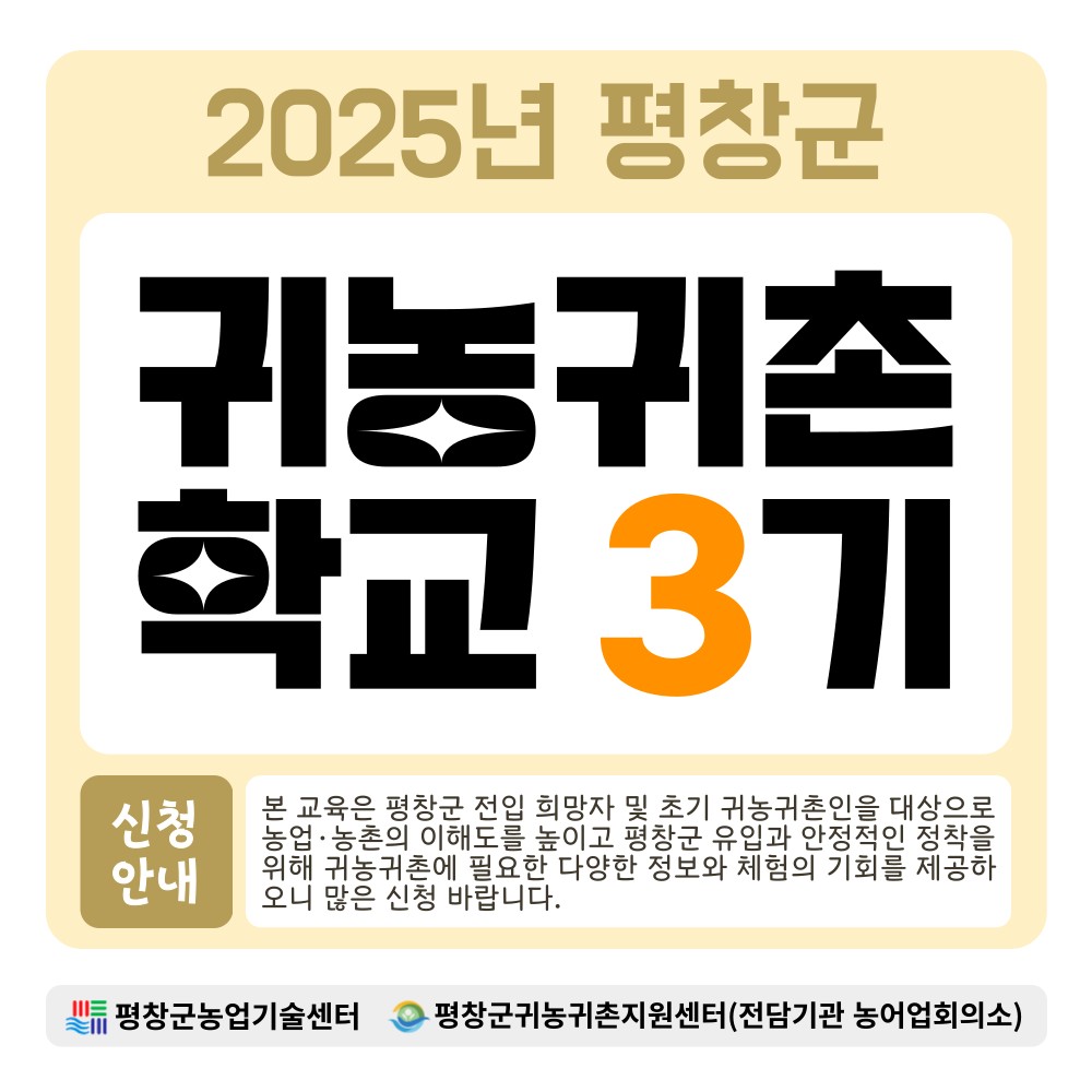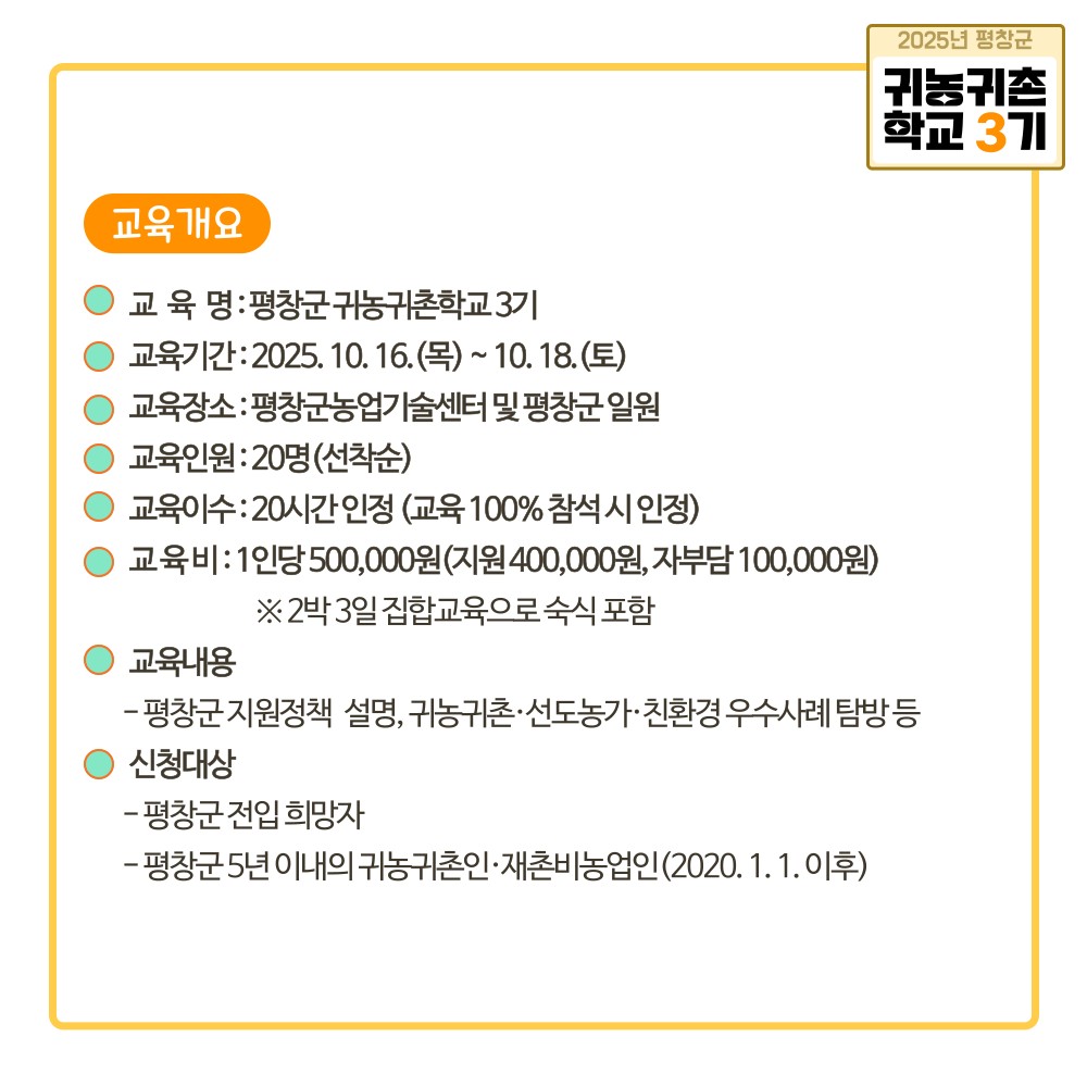 교육대상은 평창군 전입 희망자와 2020년 1월 1일 이후 전입한 5년 이내 귀농귀촌인, 재촌 비농업인이다. 다만 이전 기수(2022~2024년) 교육 이수자는 지원에서 제외된다.