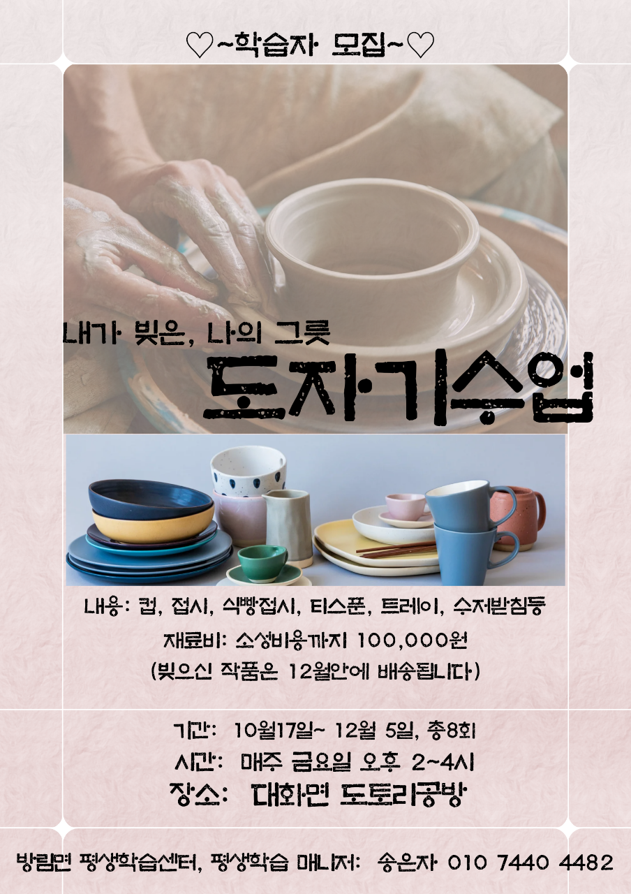 재료비와 소성비를 포함한 전체 비용은 10만 원이며, 참여를 원하는 주민은 평창군 평생학습매니저 송은자 님 에게 문의하면 된다.