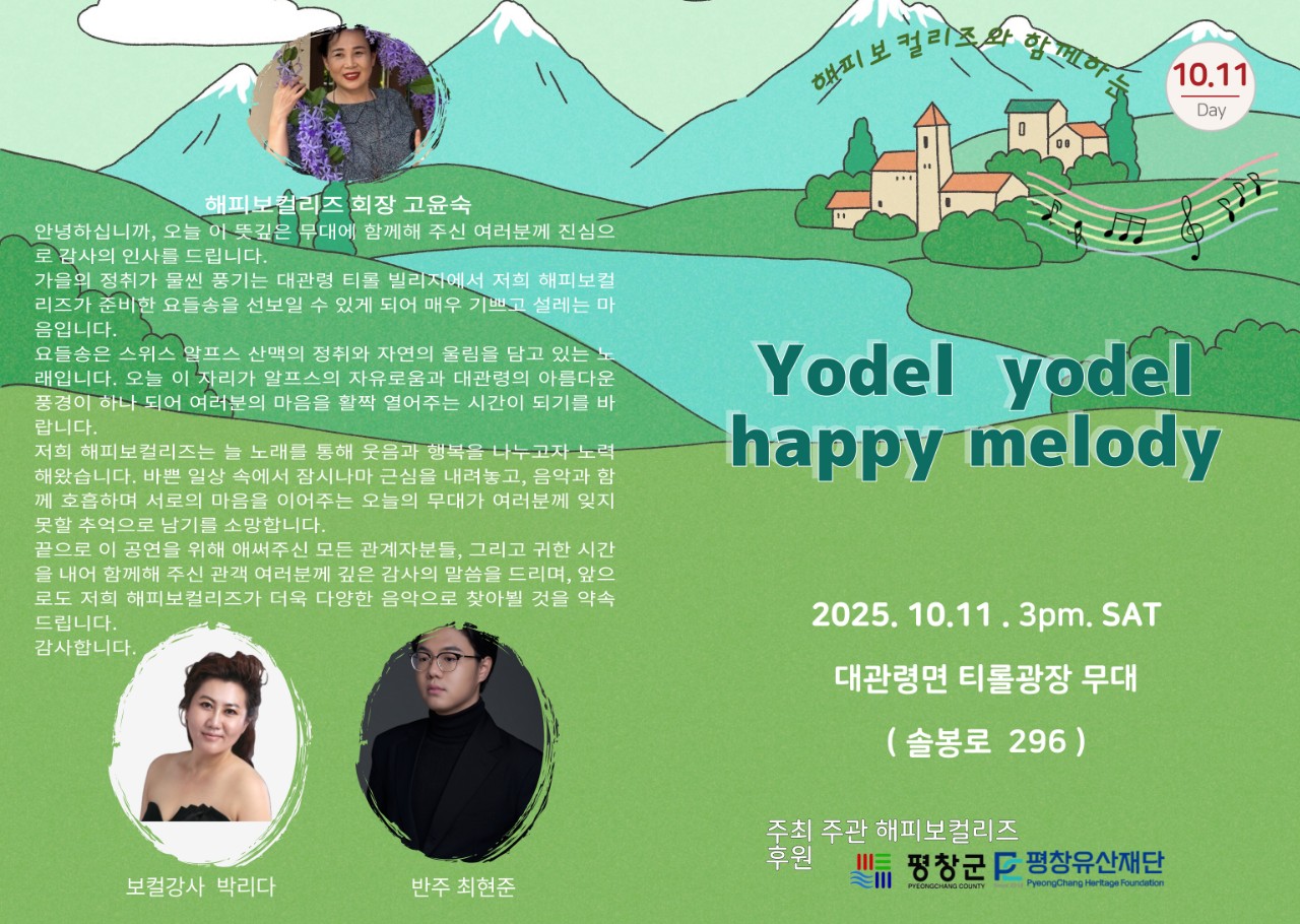 지난 주말, 평창군에서 지역 주민 예술단체 ‘해피보컬리즈’가 선보인 세계민요와 요들송 공연이 열려 관객들의 큰 호응을 얻었다.