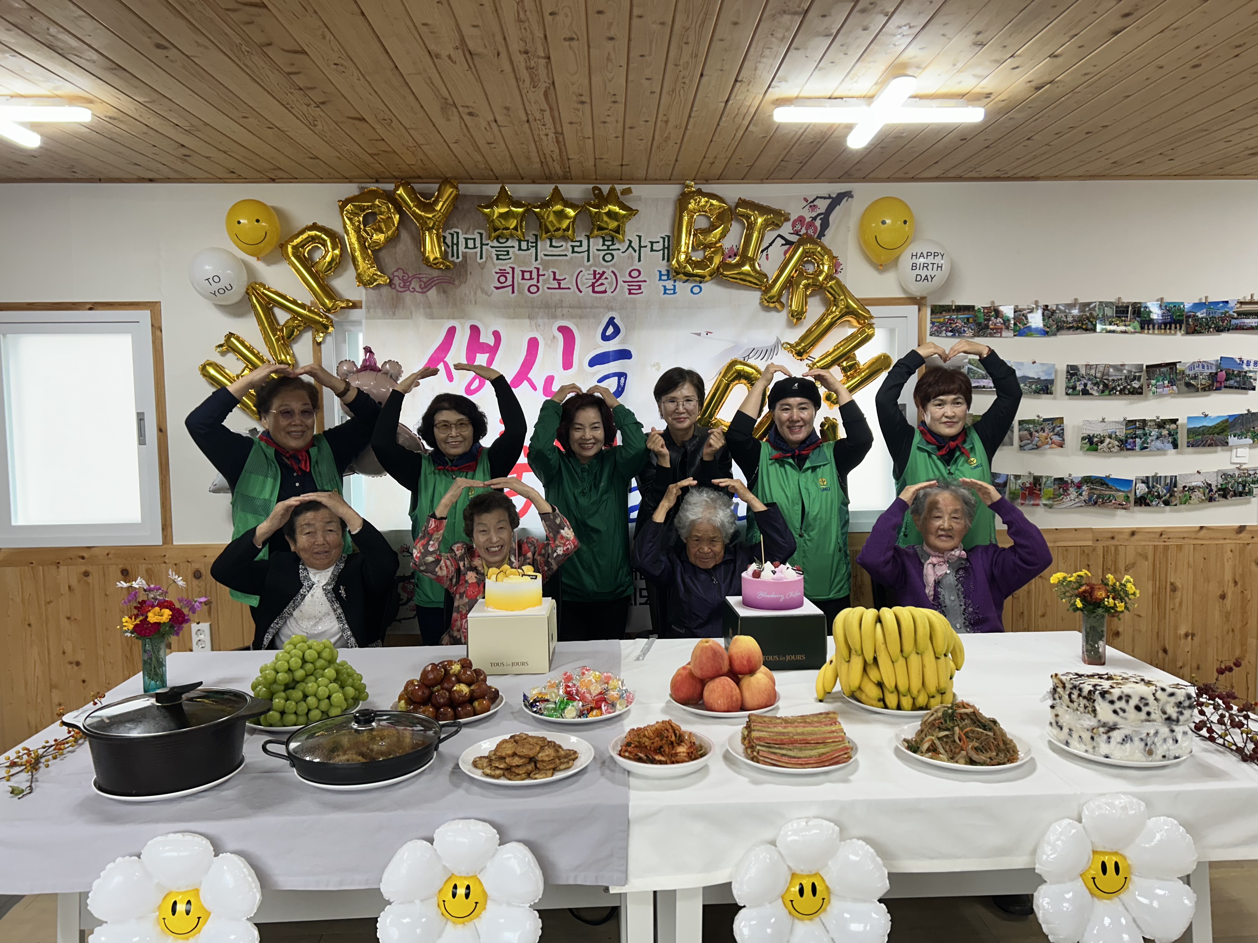 1017일 용평면새마을부녀회(회장 정해옥) 며느리 봉사대에서는 홀몸어르신을 대상으로 생신잔치를 진행하였다. 용평면 며느리 봉사대는 매년 부녀회원 4명이 홀몸어르신 4명을 대상으로 자매결연을 맺고 1년동안 병원동행, 시장보기, 안부확인, 밑반찬 만들기 등 주기적으로 돌봄을 실시하고 있다.