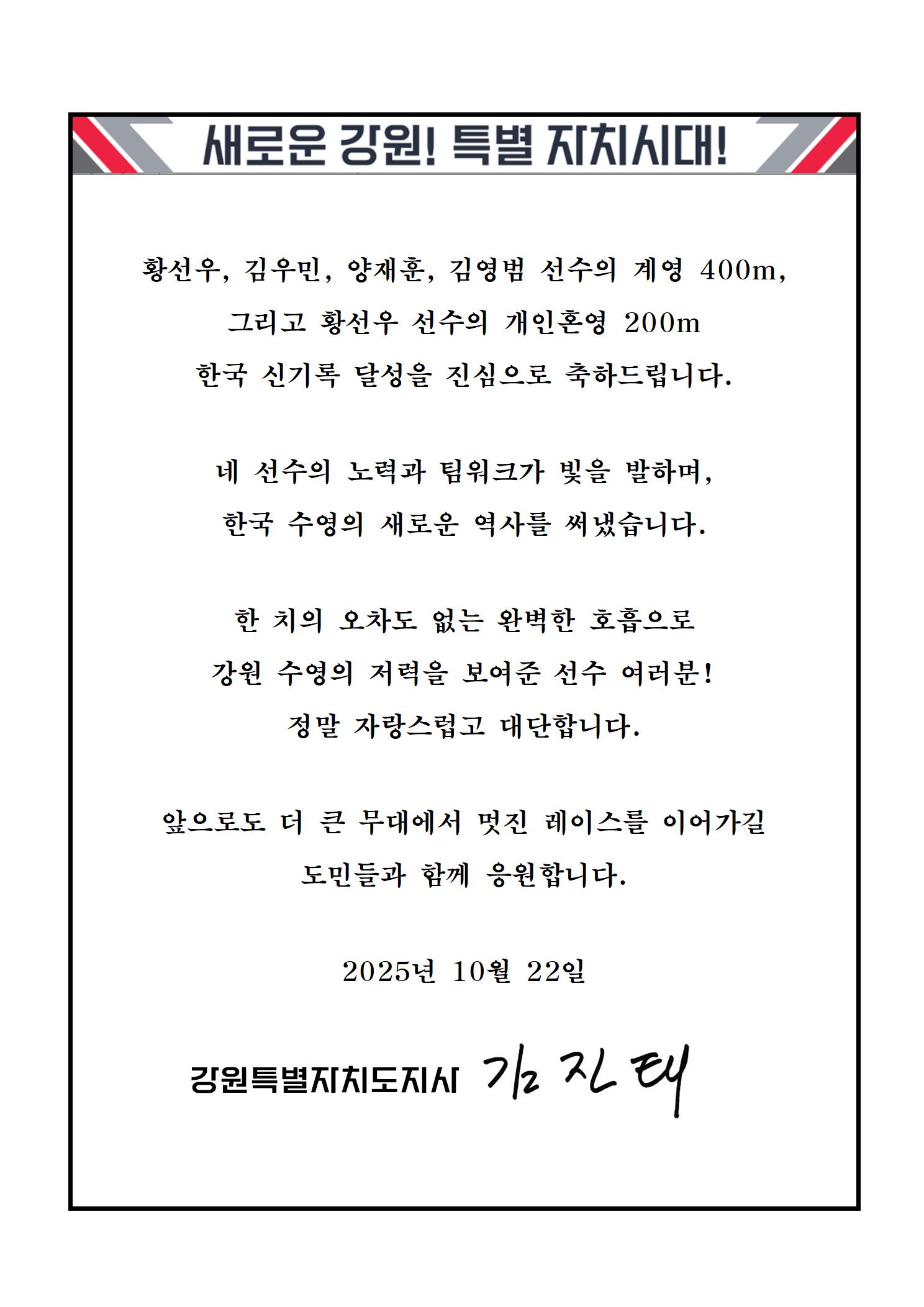 김진태 지사, 제106회 전국체전 신기록 달성한 황선우‧김우민 등 강원 수영 선수들에게 축전