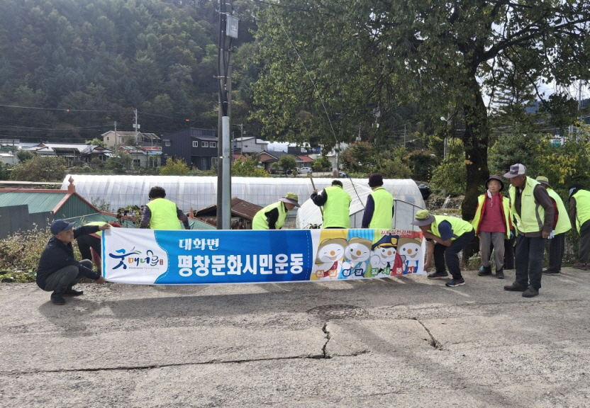 지난 10월 24일, 대화면 대화3리(이장 김재기) 주민 10여 명은 ‘굿-매너 문화시민운동’ 청결과제 실천의 일환으로 마을 일대에서 제초작업을 실시했다.