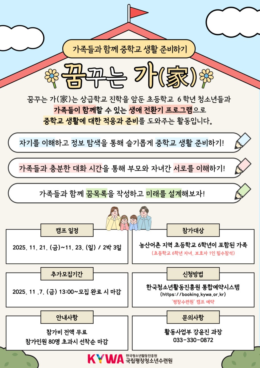 국립평창청소년수련원이 2025년 교급전환기(초등학교 6학년) 청소년과 가족을 위한 가족캠프 ‘꿈꾸는 家(가)’ 참가 가족을 모집한다.