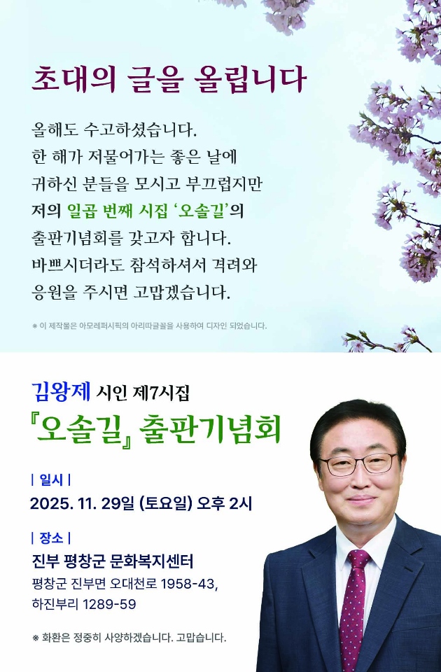 김왕제 시인은 그동안 꾸준한 창작 활동을 이어오며 지역 문학 발전에 기여해 왔으며, 새 시집 『오솔길』은 그의 시 세계를 다시 한 번 확인할 수 있는 작품집으로 평가되고 있다. 출판기념회 안내문은 “화환은 정중히 사양한다”는 문구를 함께 전달하며 참석자들의 따뜻한 관심을 부탁했다.