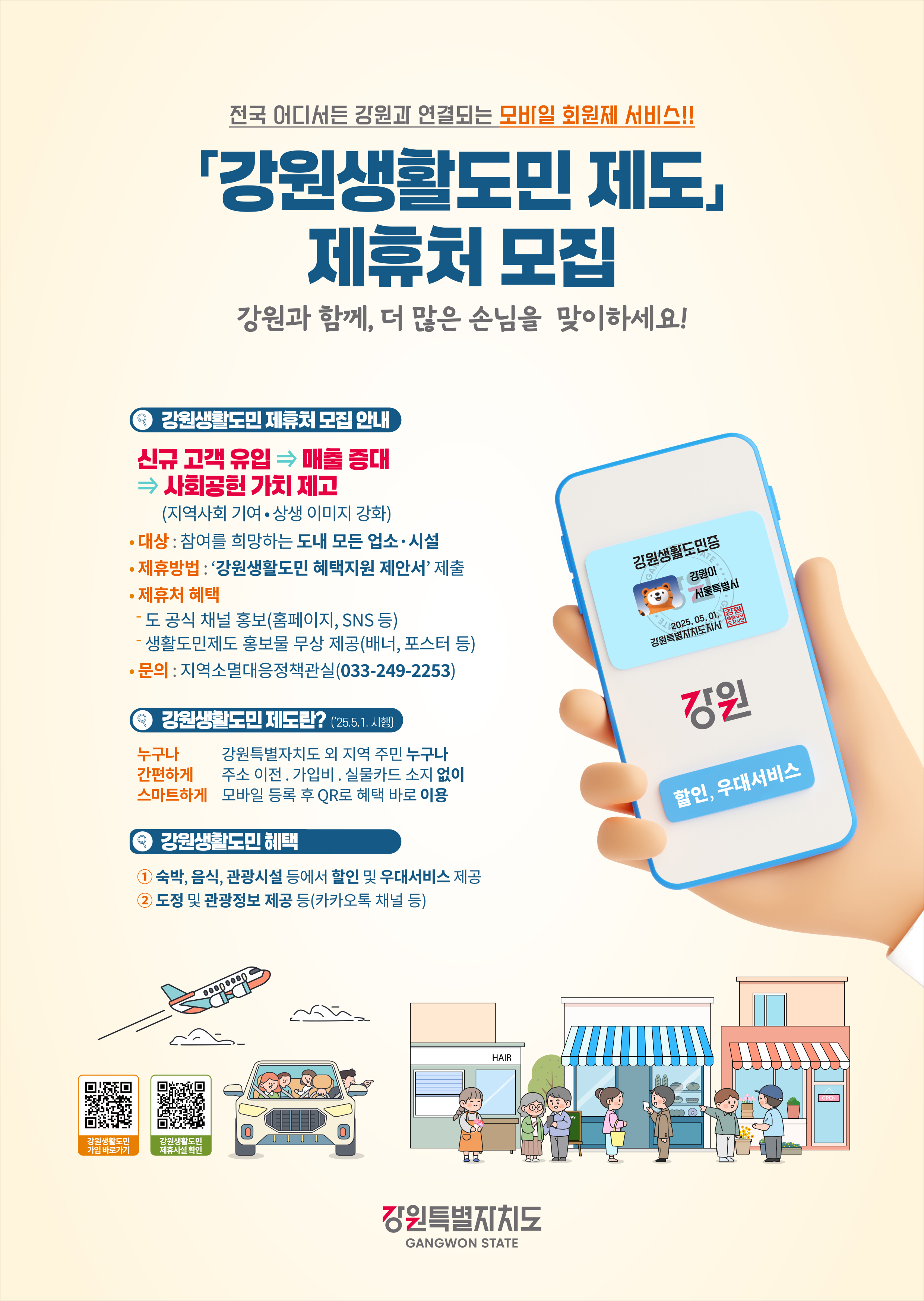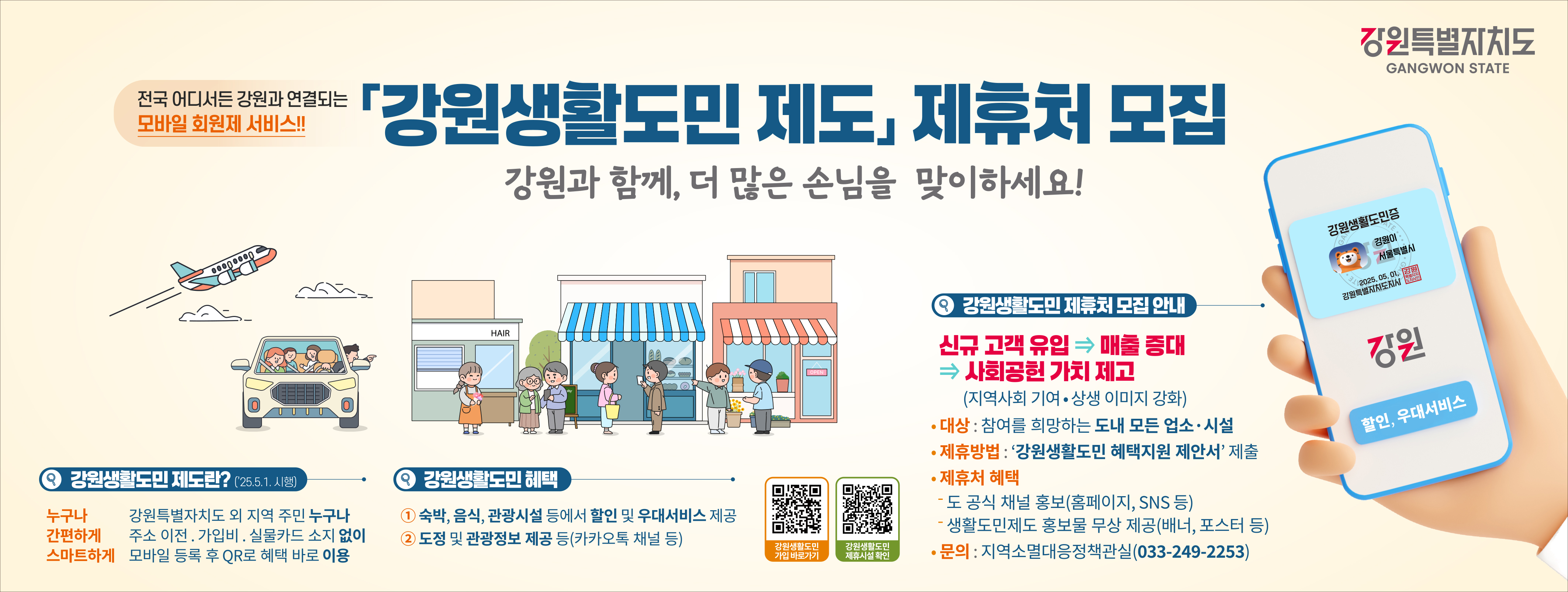 강원특별자치도는 내년 5월 1일 시행 예정인 ‘강원생활도민 제도’의 운영에 맞춰 제도 참여 사업장을 공개 모집한다고 밝혔다. 이번 제도는 모바일 기반의 회원 서비스로, 강원을 방문하는 외지인을 생활도민으로 등록해 지역 경제 활성화를 도모하기 위해 마련됐다.