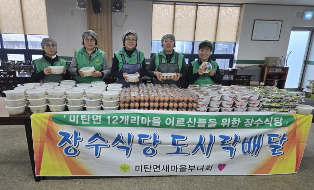 미탄면 새마을부녀회(회장 김정희)는 지난 12월 14일과 15일 이틀간 미탄복지회관에서 장수식당을 운영하며, 거동이 불편하고 식사 준비에 어려움을 겪는 어르신 200가구에 삼계탕과 각종 반찬으로 구성된 도시락을 전달했다.