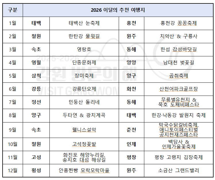 강원특별자치도와 강원관광재단은 ‘2025~2026 강원 방문의 해’를 맞아 2026년 한 해 동안 관광객들에게 강원관광의 사계절 매력을 월별로 집중 조명할 ‘2026 이달의 추천 여행지’ 최종 리스트를 발표했다.