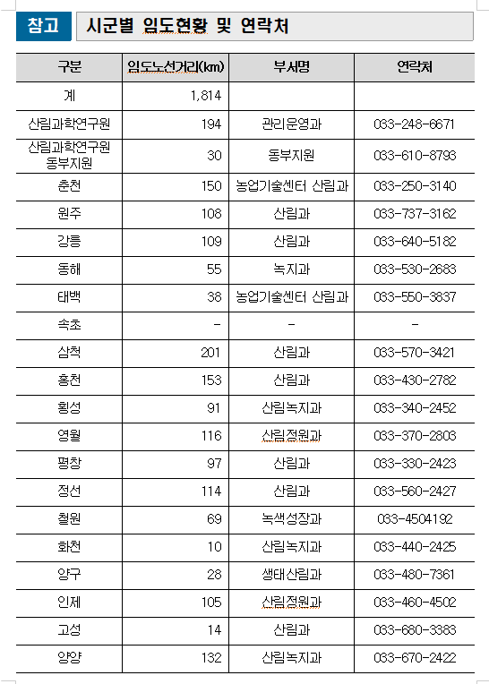 이번에 개방되는 임도는 도 사업소와 시군에서 관리 중인 지방임도 총 1,814km 구간이며, 폭설이나 결빙 등으로 안전사고 우려가 있는 일부 구간은 개방 대상에서 제외된다. 개방 여부 등 자세한 사항은 해당 시군 산림부서로 문의하면 된다.