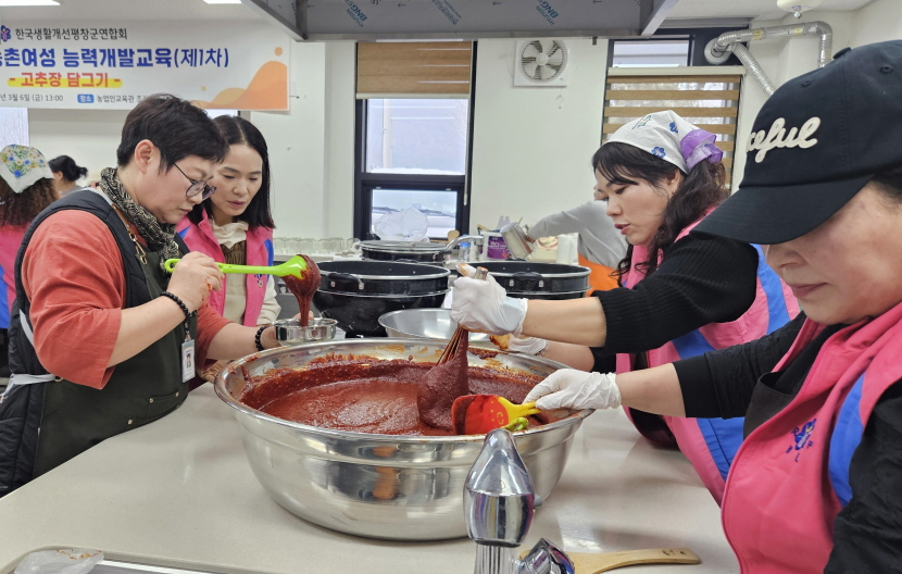 지난(3.6), (사)생활개선회평창군협의회(회장 김현옥) 회원 30여 명은 농업인교육관 조리실습실에서 지역농산물을 활용한 고추장 담그기 체험교육을 실시한 후, 이웃사랑 실천을 위해 손수 담근 고추장 40병을 군 사회복지협의회에 기탁하였다.