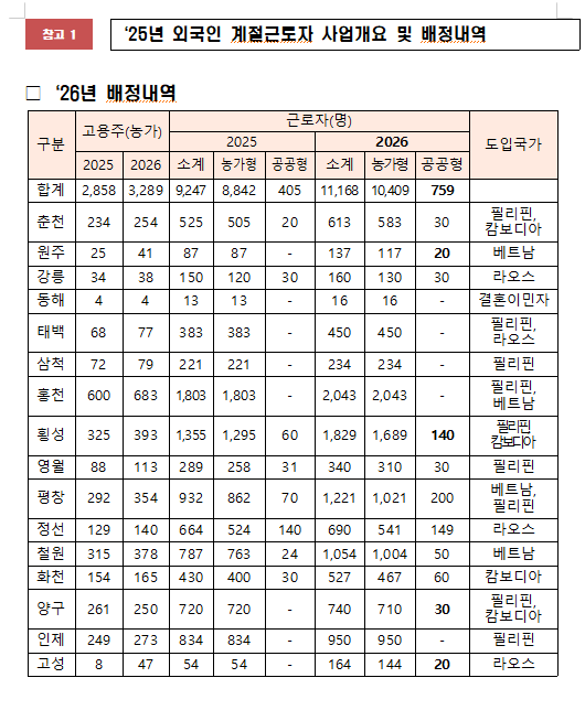 특히 강원특별자치도지사 주관 외국인 계절근로자 활성화 간담회(2026. 1. 21.) 후속 조치로 농림축산식품부 공모사업에 선정되지 못한 운영 주체(농협)를 대상으로 지방 자체사업을 추진해 4개 시군 4개소에 100명을 추가 배정했다.