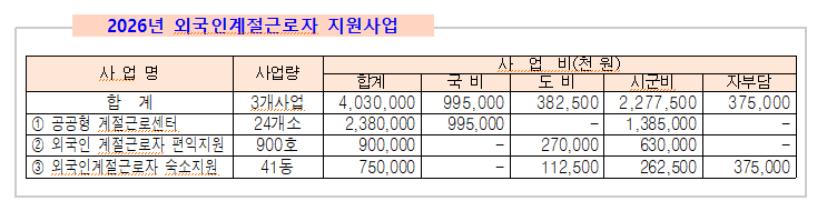 주요 사업으로는 공공형 계절근로센터 조성, 외국인 계절근로자 편익 지원(의료공제회·고용보험·산재보험 등), 숙소 지원 등 체류환경 개선이 포함된다.