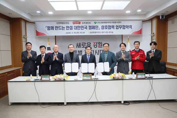 강원특별자치도(도지사 김진태)는 3월 19일 오전 11시 도청 소회의실에서 삼화페인트공업(주)(대표이사 배맹달), 강원특별자치도자원봉사센터(이사장 박광구)와 함께 「함께 만드는 안심 대한민국 캠페인」 추진을 위한 산불예방 업무협약(MOU)을 체결했다