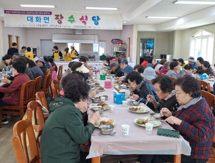 어제(4.23.), 대화면 적십자봉사회(회장 이은경) 회원 10여 명은 대화문화체육관 피로연장에서 장수식당을 운영하여 어르신 100여 명에게 점심식사를 대접하였다.
