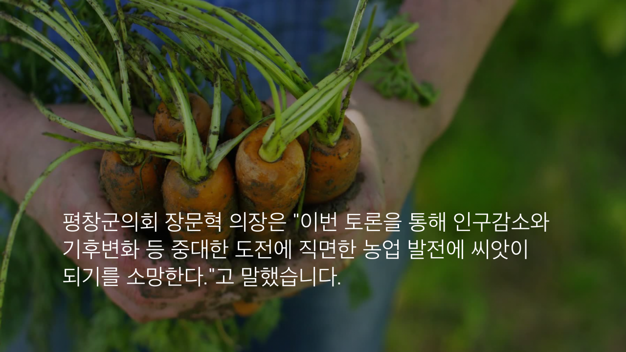평창군의회 장문혁 의장은 "이번 토론을 통해 인구감소와 기후변화 등 중대한 도전에 직면한 농업 발전에 씨앗이 되기를 소망한다."고 말했습니다.