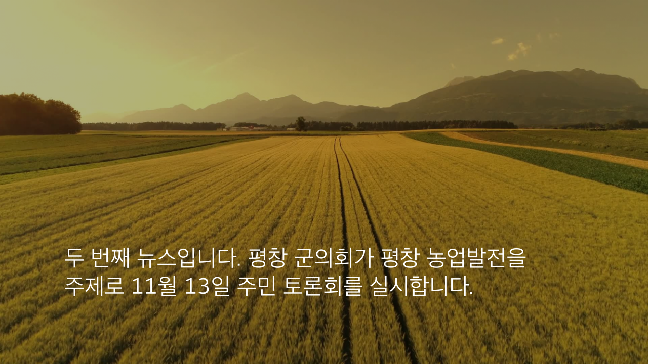두 번째 뉴스입니다. 평창 군의회가 평창 농업발전을 주제로 11월 13일 주민 토론회를 실시합니다.