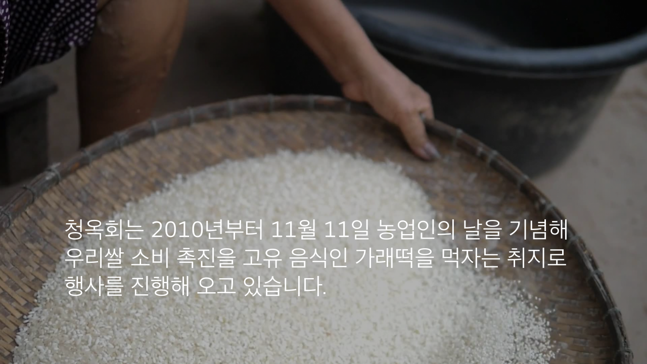청옥회는 2010년부터 11월 11일 농업인의 날을 기념해 우리쌀 소비 촉진을 고유 음식인 가래떡을 먹자는 취지로 행사를 진행해 오고 있습니다.