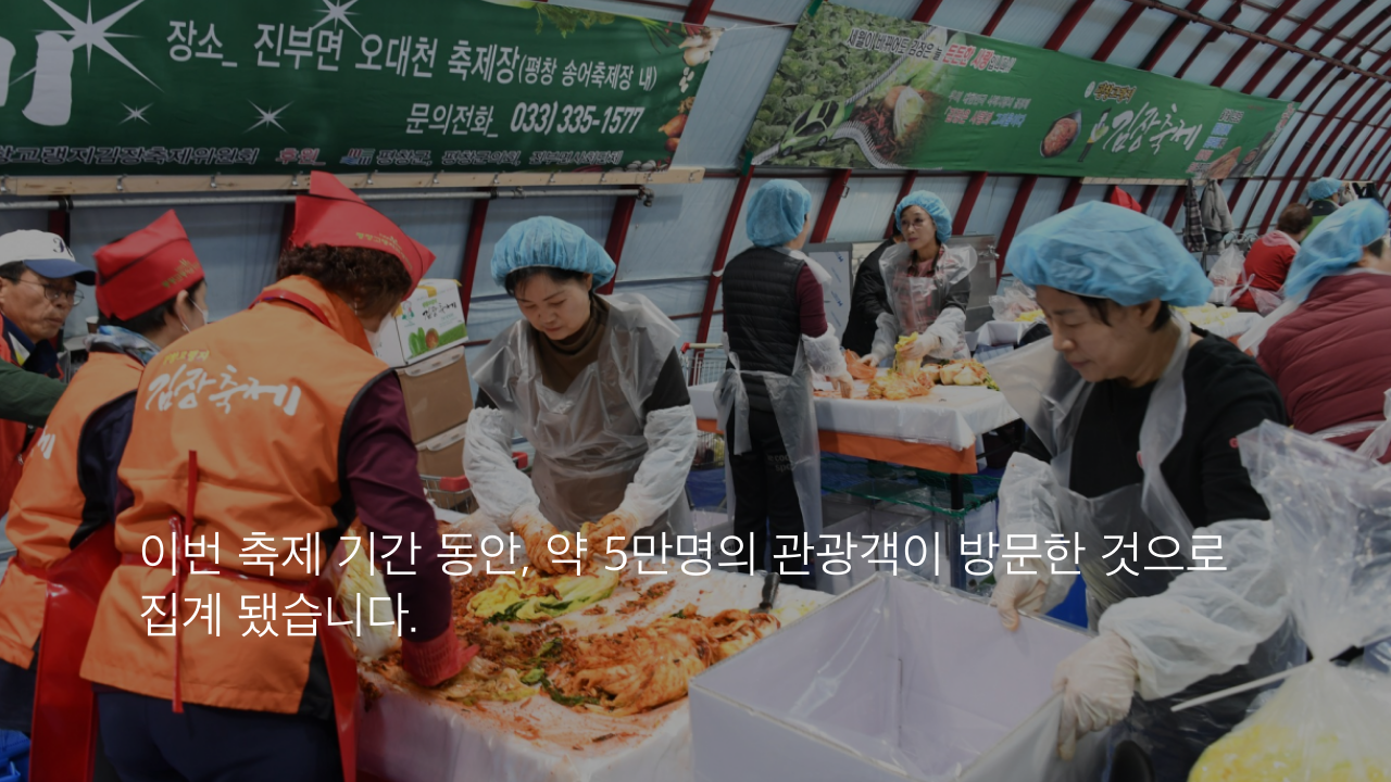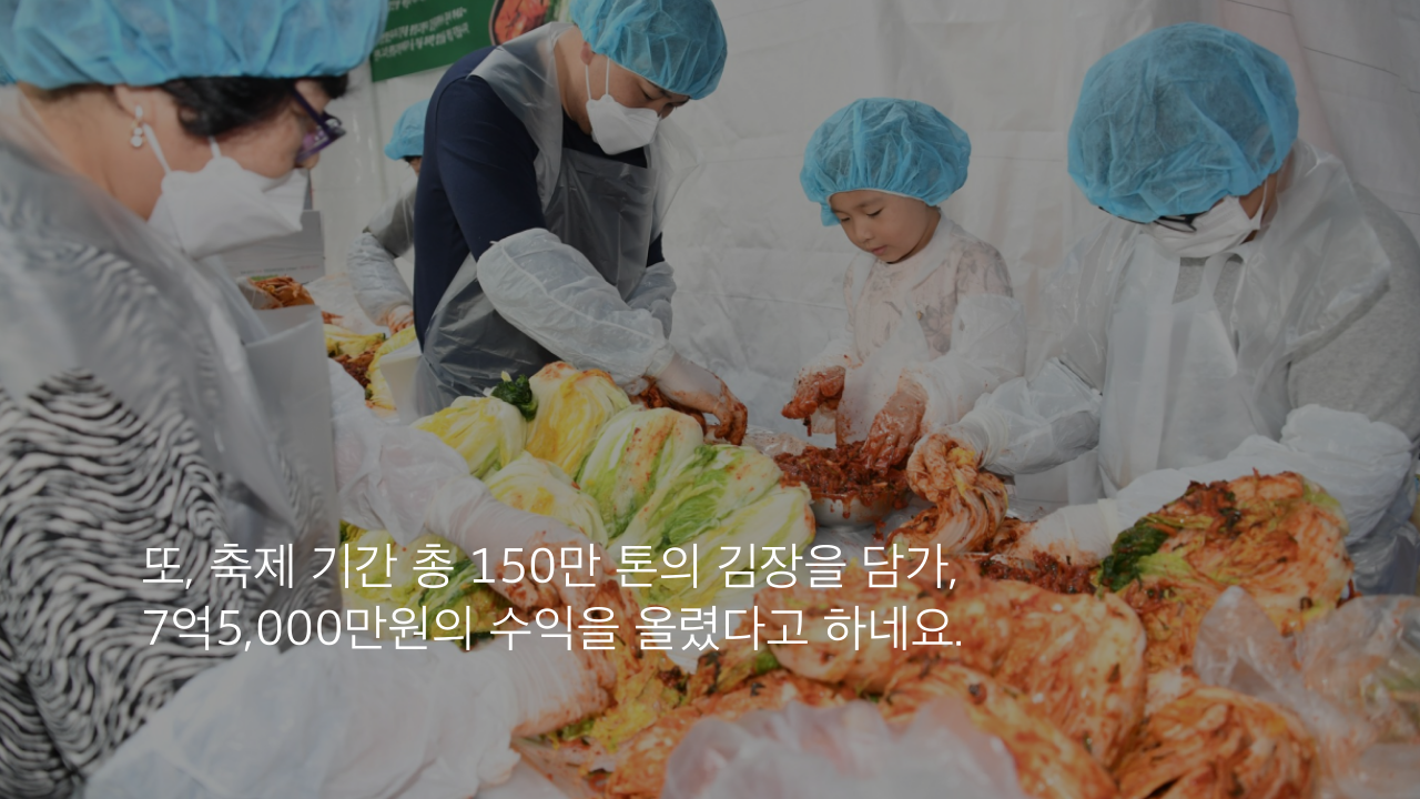 또, 축제 기간 총 150만 톤의 김장을 담가, 7억5,000만원의 수익을 올렸다고 하네요.