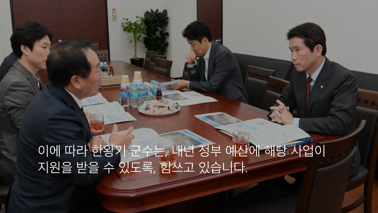 이에 따라 한왕기 군수는, 내년 정부 예산에 해당 사업이 지원을 받을 수 있도록, 힘쓰고 있습니다.