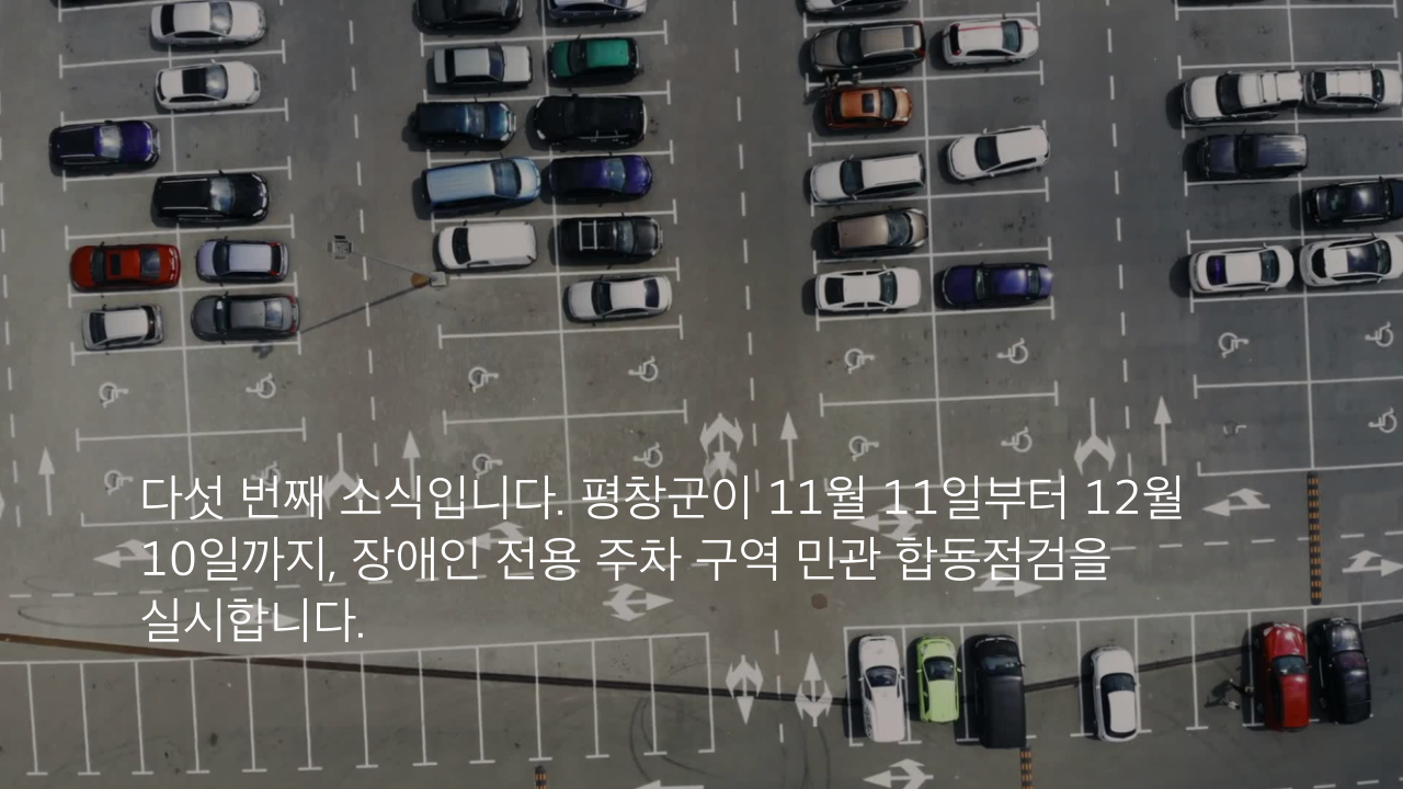 다섯 번째 소식입니다. 평창군이 11월 11일부터 12월 10일까지, 장애인 전용 주차 구역 민관 합동점검을 실시합니다.