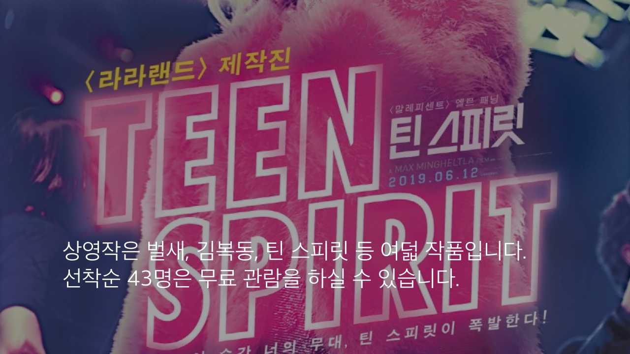 상영작은 벌새, 김복동, 틴 스피릿 등 여덟 작품입니다. 선착순 43명은 무료 관람을 하실 수 있습니다.